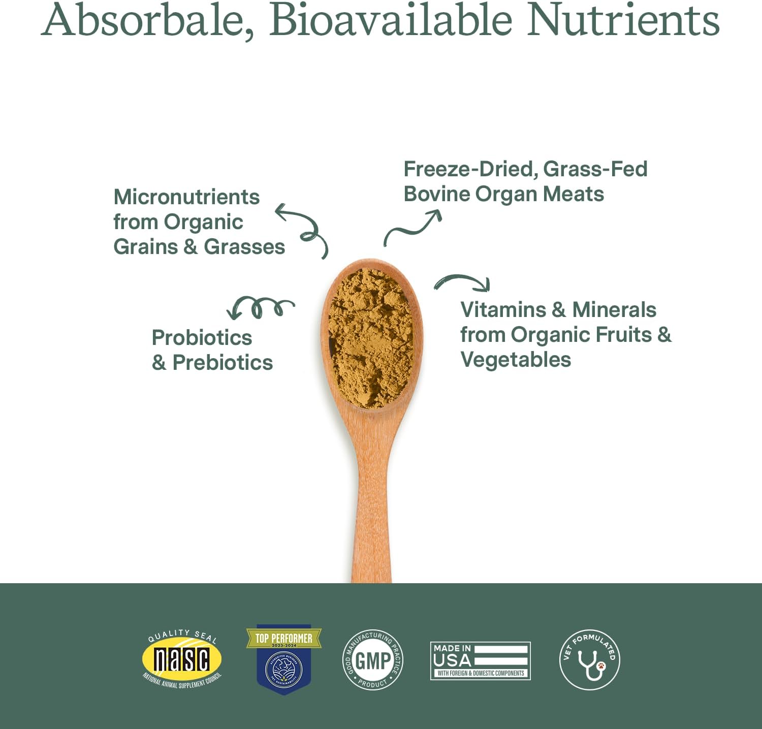 No fillers: Dog and cat multivitamin is formulated with vitamin and mineral rich grass-fed organ meats; organic vegetables, greens and fruits; Inulin (from Chicory Root) and Bacillus coagulans for muscle, coat, heart, and gut support