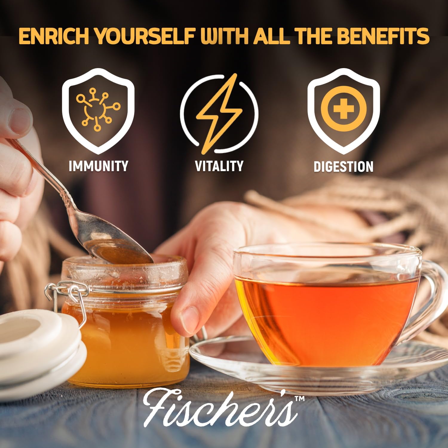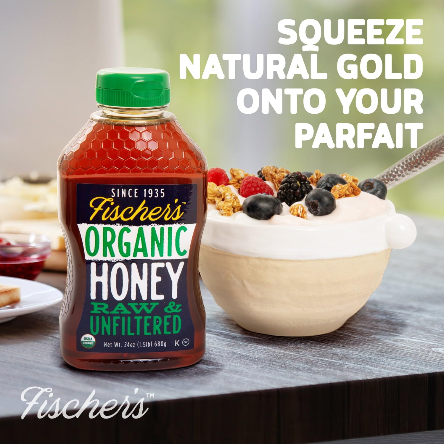 Fischer’s 100% Organic Honey is raw, pure, unprocessed, honey that’s responsibly sourced straight from beekeepers to your table. Dedicated to bee welfare, our honey is 100% raw, unfiltered, and unpasteurized—no additives, syrups, or flavors. Enjoy it packaged in a convenient 24 oz squeeze bottle for easy use. Our all-natural raw unfiltered honey serves as a sweetener and sugar substitute, perfect for drizzling on fruits, yogurt, smoothies, acai bowls, as well as on toasts, pancakes, hummus or roasted veggies. Its rich flavor and sweetness elevate your tea, coffee, and desserts, and give a distinctive twist to your dishes. Do not feed to children under one year old. With naturally preserved vitamins, minerals, and antioxidants, our unfiltered raw honey offers full nutritional benefits. Over time, it may crystallize, showcasing its pure origin. Experience the unadulterated sweetness of raw unpasteurized honey, straight from the hive to your table. Available on Amazon and grocery stores across the country, our natural organic raw unprocessed honey is the essence of quality and authenticity. Treat yourself to the pure indulgence of real raw organic honey —nature’s golden elixir