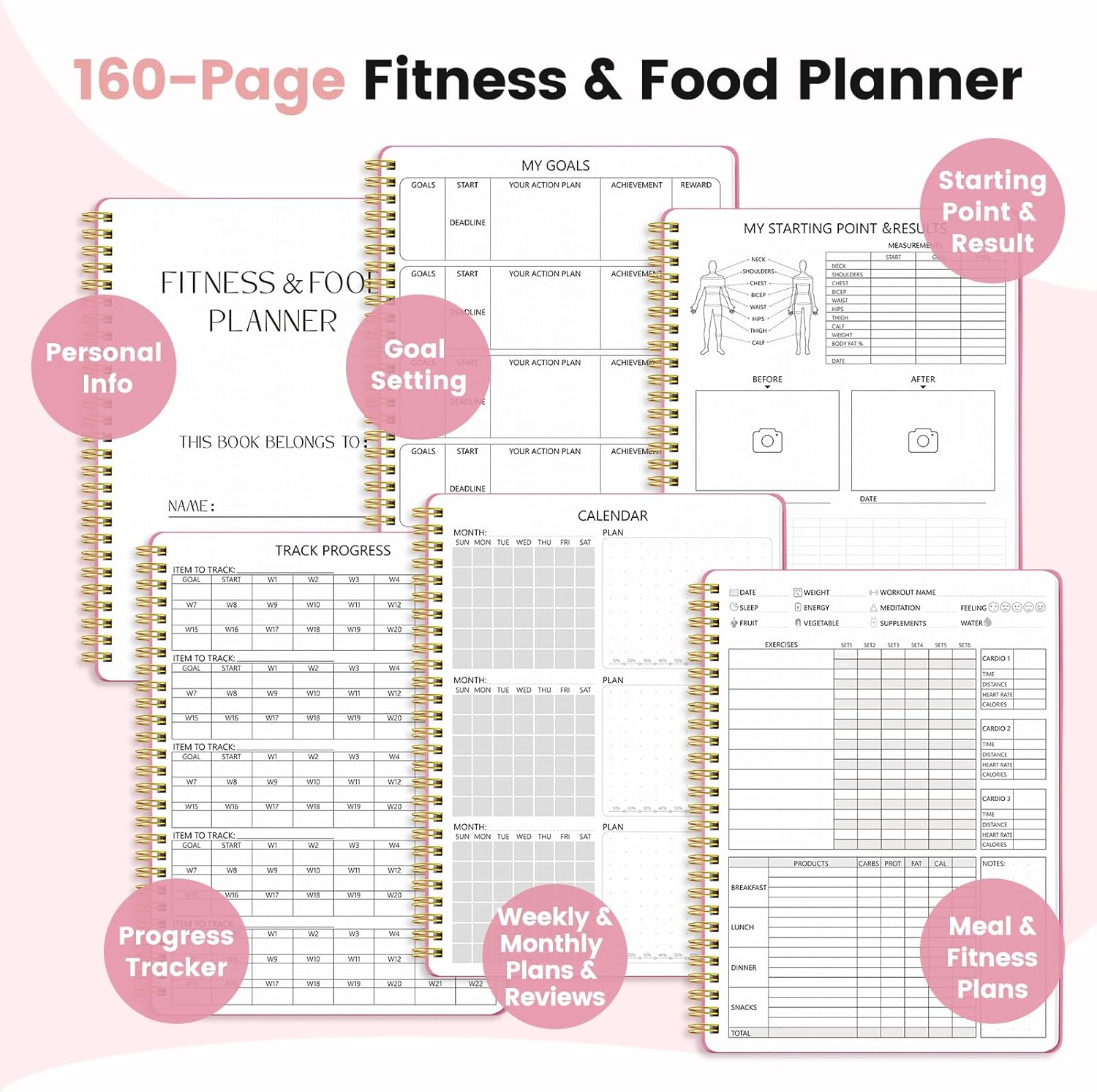 🥗Structured goal setting and achievement: the 2 goal pages of fitness planner has 10 sections for setting clear objectives, start and end dates, detailed plans, and results. The workout journal also features a reward section to motivate you to achieve your fitness milestones