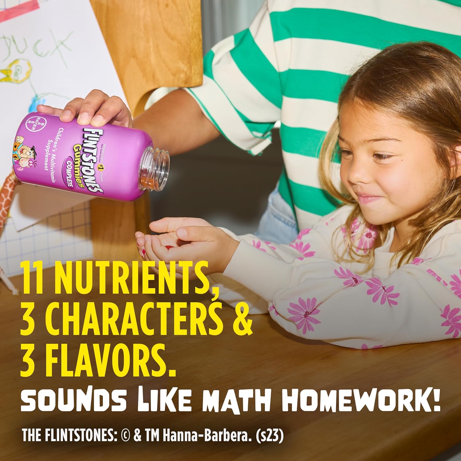 11 nutrients, 3 characters & 3 flavors. Sounds like math homework! Flintstones children’s vitamins have been providing kids nutritional support as they grow up healthy and strong for more than 50 years. For the “five-second-rule” families, we’ve got a complete multivitamin with many key nutrients, in easy-to-chew, tasty, assorted fruit flavored gummies like natural raspberry, cherry, and orange flavors with other natural flavors that your kids will love. These daily kids & toddler vitamin for ages 2+ provide vitamins and minerals that growing bodies may need. Flintstones Complete multivitamin gummies have 5 B vitamins to support physical energy by helping convert food to fuel, while these kids vitamins also contain nutrients to support bone health, immune health, and eye health in a fun shaped gummy.* Flintstones Complete Gummies vitamins for kids come in classic Flintstones characters and in tasty flavors. *This statement has not been evaluated by the Food and Drug Administration. This product is not intended to diagnose, treat, cure, or prevent any disease. THE FLINTSTONES: © & TM Hanna-Barbera. (s24)
