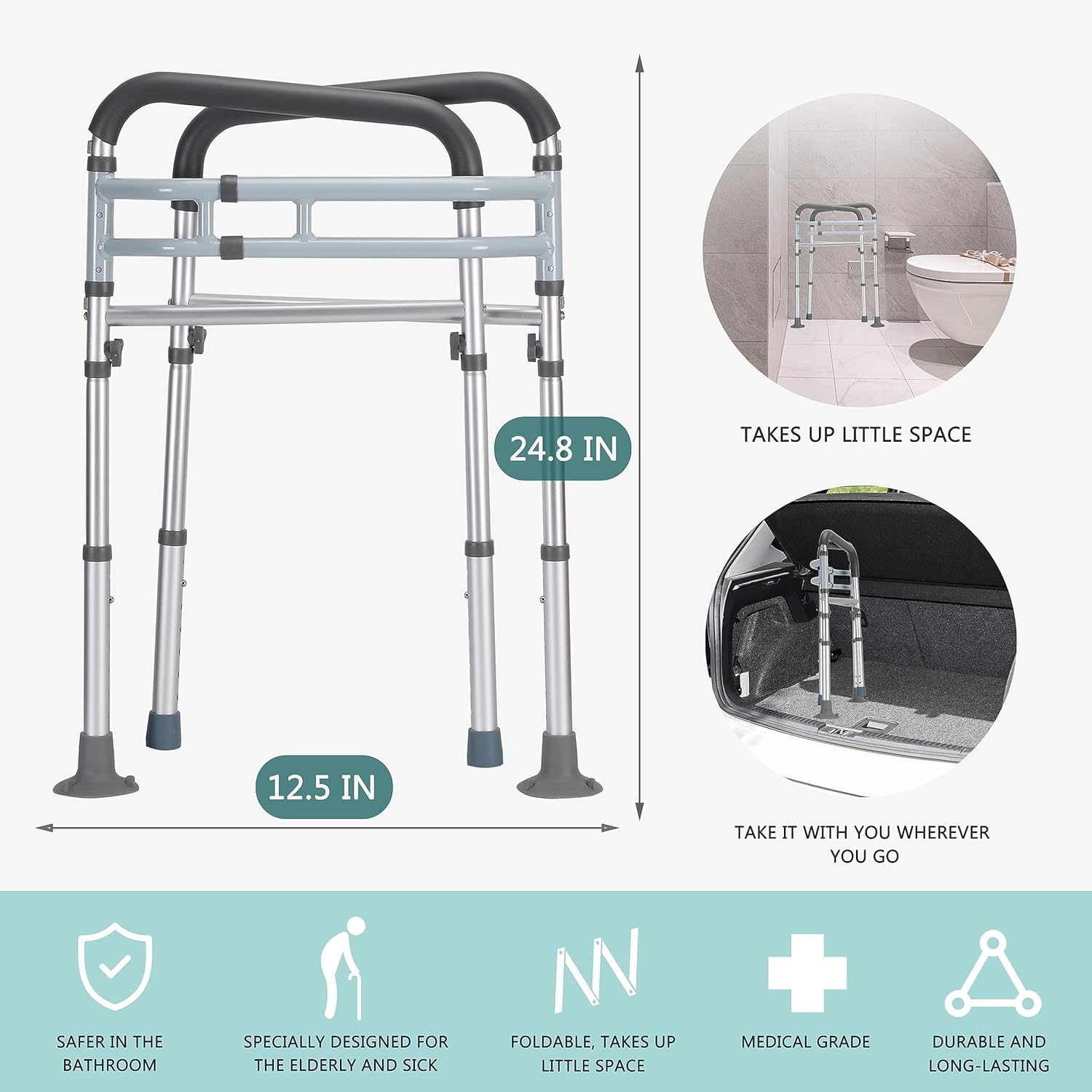 ADJUSTABLE HEIGHT AND WIDTH: The maximum size of our handicapped toilet rails is 16.15×4.8×13.7 inches, the height of the toilet rails can be adjusted between 24-31 inches, users can adjust it according to their own body shape and height; the width can be adjusted between 20-25 inches, which is suitable for all types of toilets. And our toilet support rails can be folded for easy storage and travel carry.