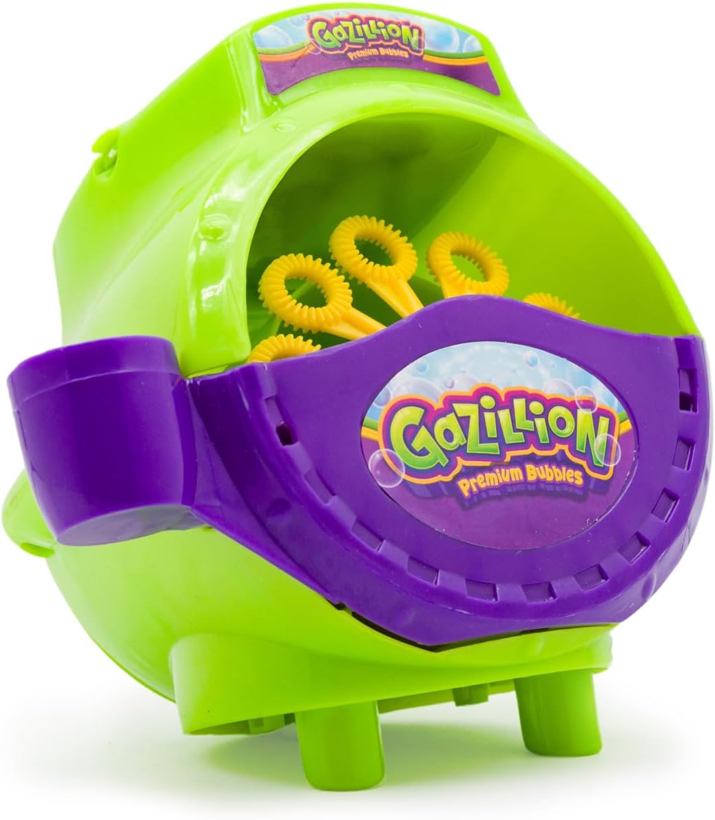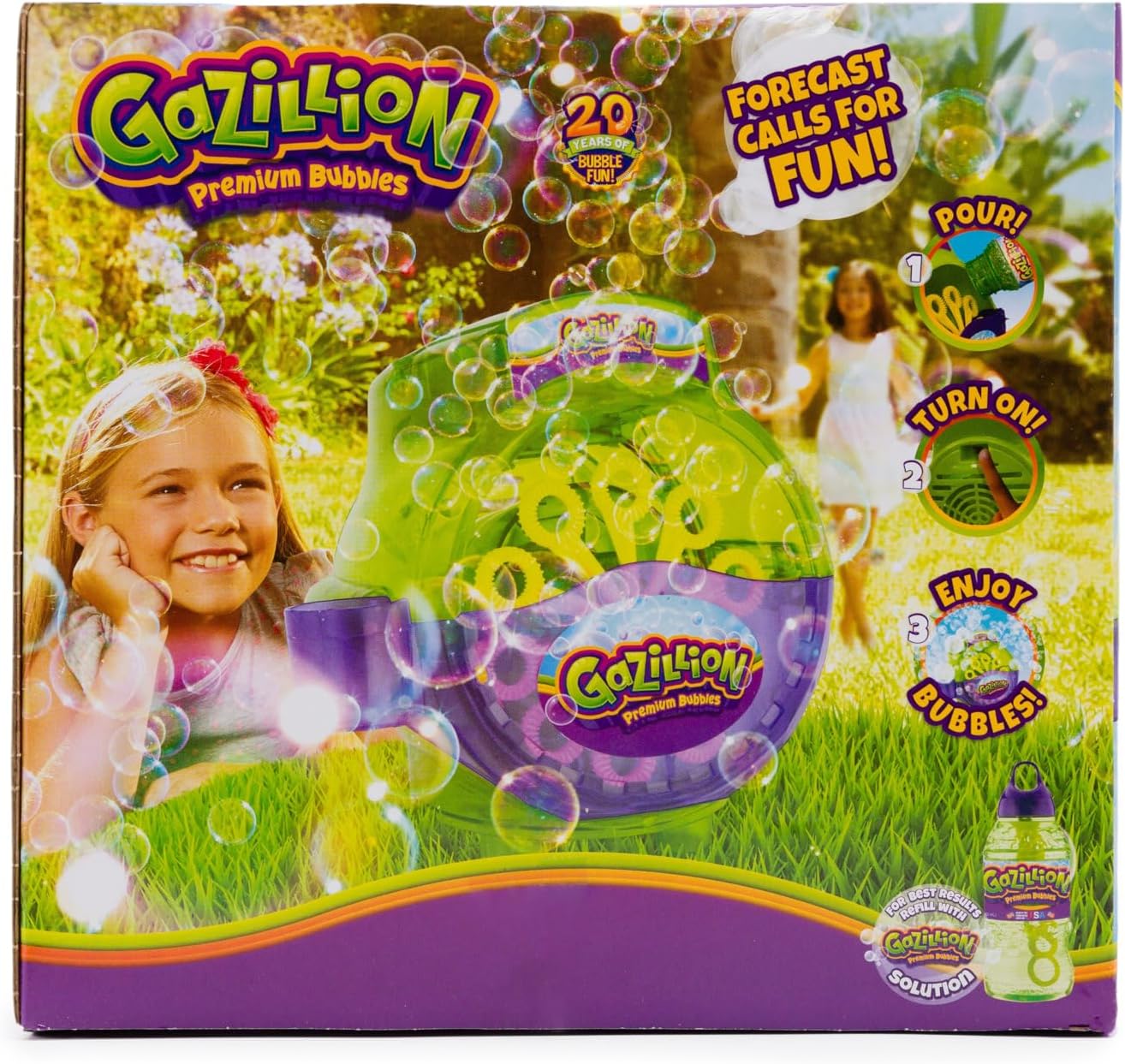 This is a fantastic item. The ORIGINAL bottle of Gazillion bubble solution worked perfectly producing thousands of bubbles per minute. BUT after the first bottle that comes with it is gone you need the SAME liquid from the SAME manufacturer or chances are it won’t work as well. This was my experience. I bought this one online, I also bought the Typhoon model at Walmart. But they don’t carry the liquid from Gazillion. They have it form someone else – which I had to buy. I had no alternative. After using the original bottle that came with each model I refilled them with this no-name brand liquid. Both models worked terribly. Maybe 10 to 15% of the bubbles I had with Gazillions liquid. I rubbed the original liquid between my fingers. Then I did the same with the no-name brand. A definite difference in thickness of the liquids. The no-name obviously had a lot more water in it. No wonder Walmart can sell a gallon for $5! I had to play with adding dishwashing liquid to the no-name brand until I got it near the thickness of Gazillion’s liquid. Worked much better but not as good as the original.Whoever the salesman is that sells Gazillion’s products to Retailers like Walmart – he should be fired! My initial reaction was to return both units because Walmart doesn’t carry the right replacement liquid. It IS the Gazillion salesperson’s responsibility to ensure Retailers like Walmart carry the right replacement liquid for their product. Otherwise it won’t work properly. I’ll bet dollars to donuts Walmart and other Retailers get a lot of Gazillion bubble makers returned because customers did exactly what I did. Buy the no-name liquid (because they don’t carry a refill bottle of liquid from Gazillion) and discover it doesn’t work. Walmart looks at the high return rate and discontinues Gazillion bubble makers.
