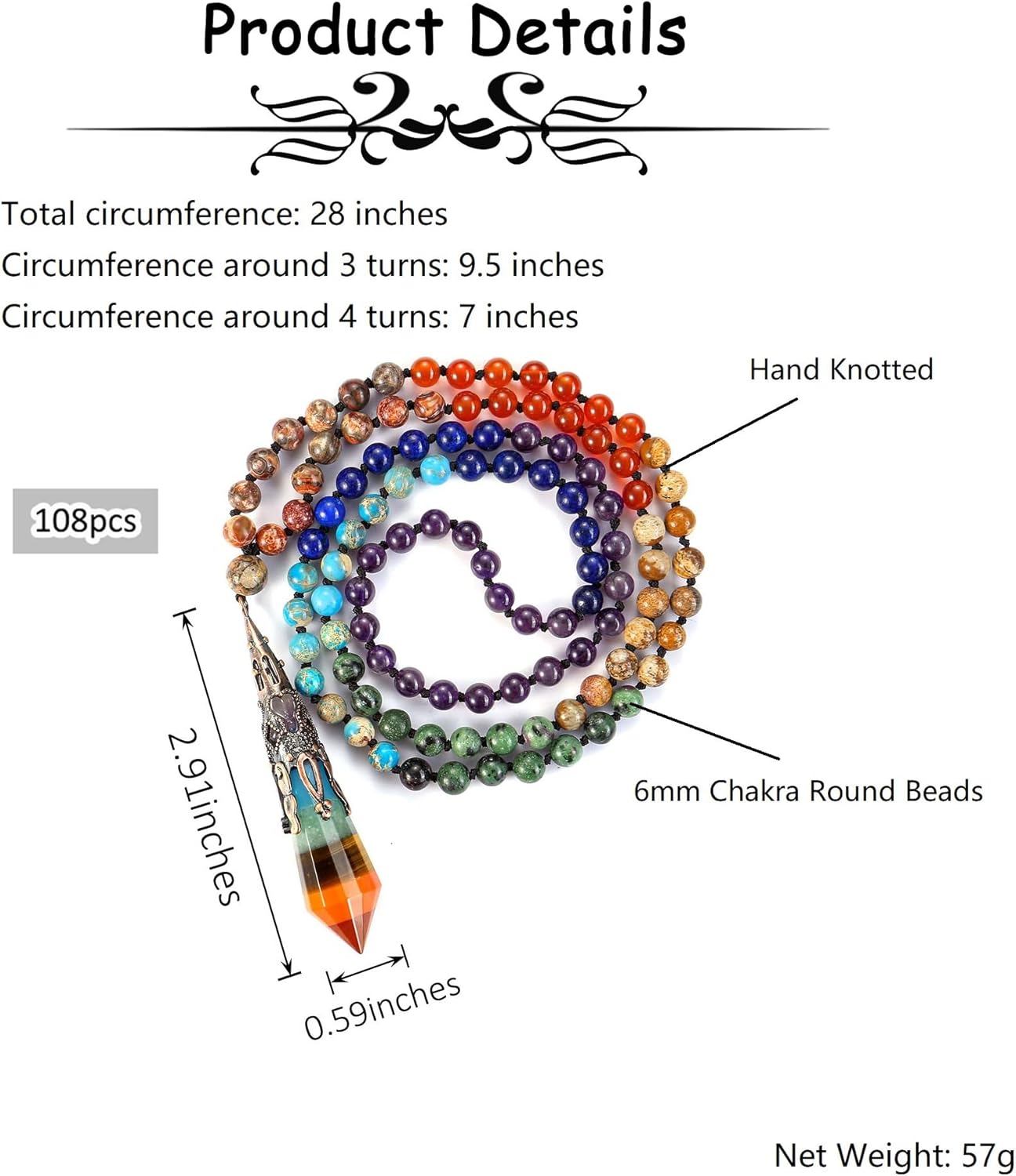 GEHECRST Natural 7 Chakra 108 Mala Prayer Beads Necklace with Reiki Healing Crystal Pointed Pendant 6mm Gemstones Beads Necklace Mens Womens Jewelry for Meditation, Protection