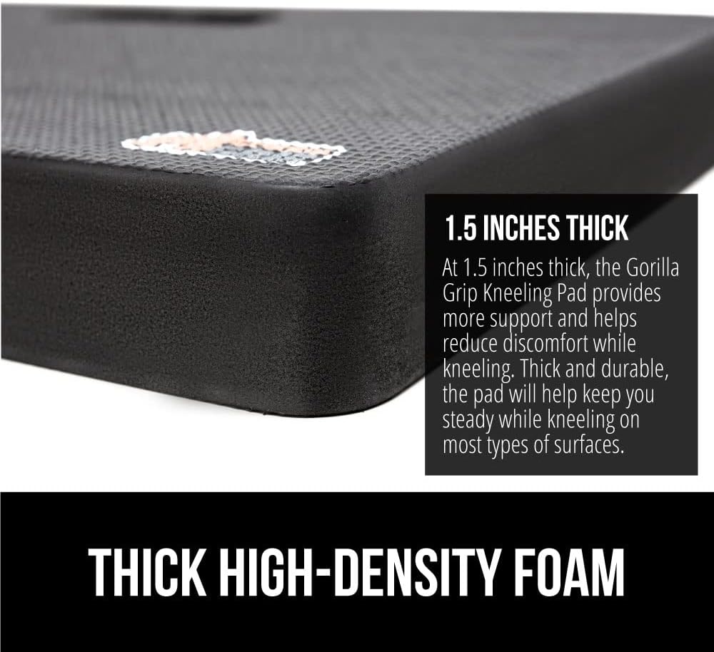 The Gorilla Grip Kneeling Pad is constructed from ultra durable, high density foam. The 1.5 inch thick pad helps provide more support and reduce discomfort while you’re kneeling, providing 70 percent shock absorbency for more comfort.