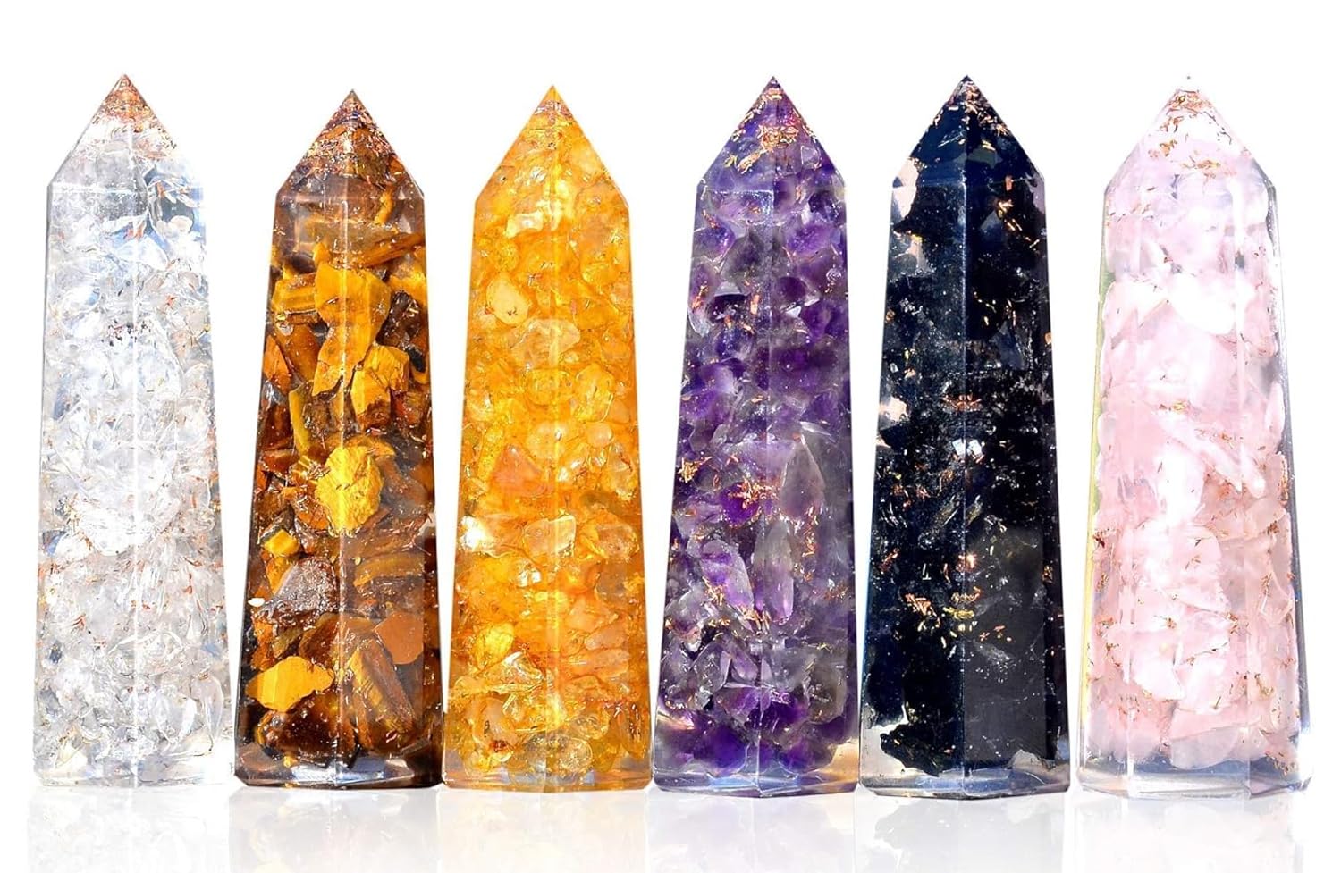 6 CRYSTAL WANDS each measure about 3″ long and are facet-cut. They include Clear Quartz, Black Tourmaline, Citrine, Rose Quartz, Tiger Eye and Amethyst Crystal. DEFLECT NEGATIVITY and activate emotionally healthy spirituality with this targeted combination of healing crystals and stones.