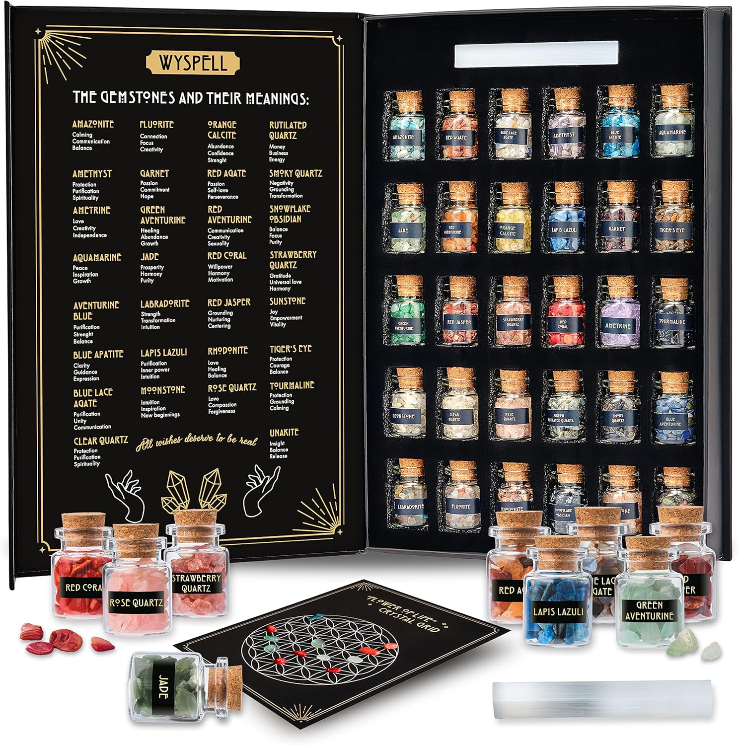 GREAT CRYSTAL KIT – Includes 30 of the most frequently used and rare small crystals for spell jars in a charming witch crystal box to protect your crystal chips for spells from external energies. Additional witch gifts: selenite, a crystal grid, and guide