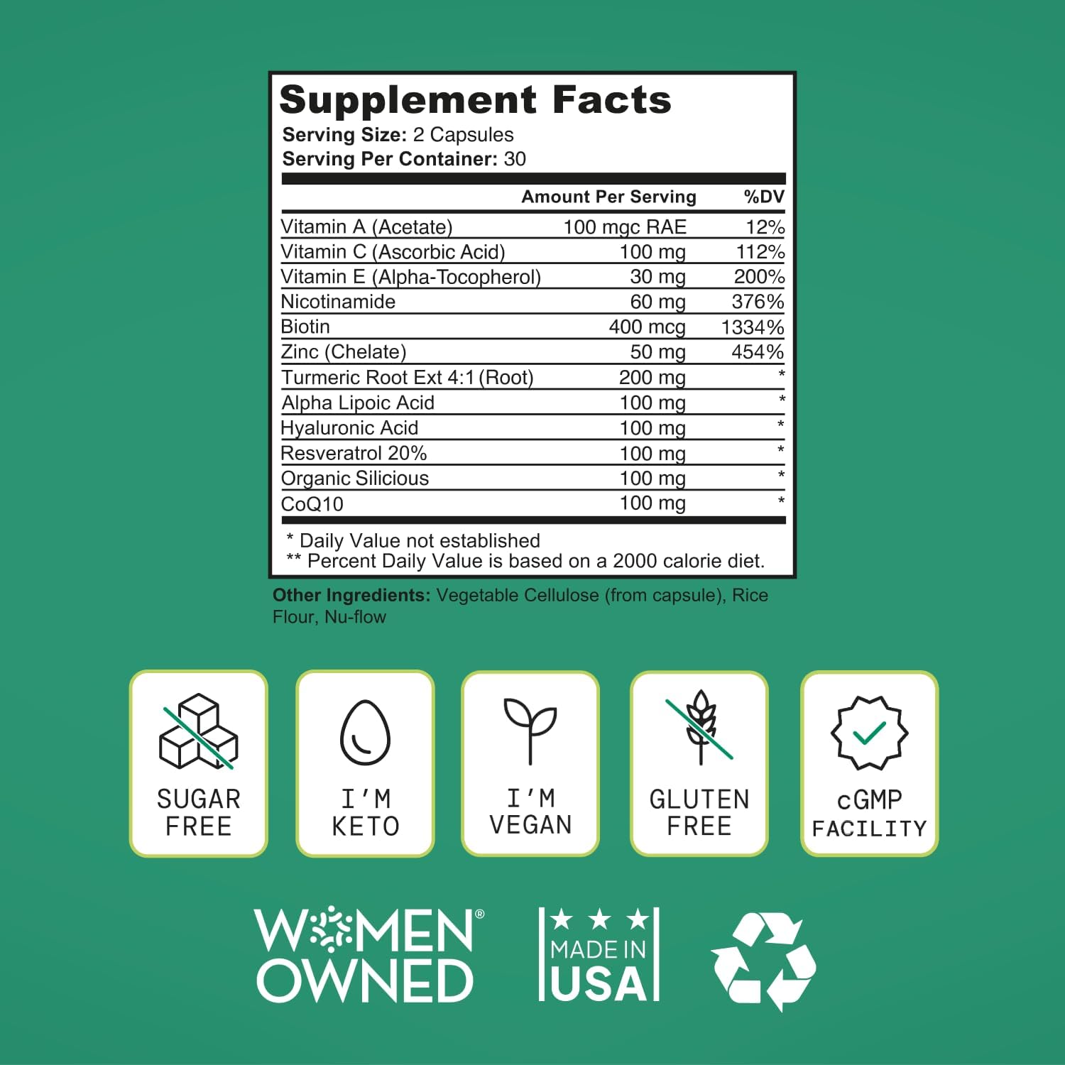 EXPERIENCE THE ULTIMATE HEALTHY AGING: With a combination of Vitamins A, C, and E, Biotin, Nicotinamide (NAD),Turmeric Root, Hyaluronic Acid, Resveratrol, Organic Silica, and CoQ10, this formula will boost NAD and collagen, reducing cells from damage so you can have unveiled youthful, radiant skin.
