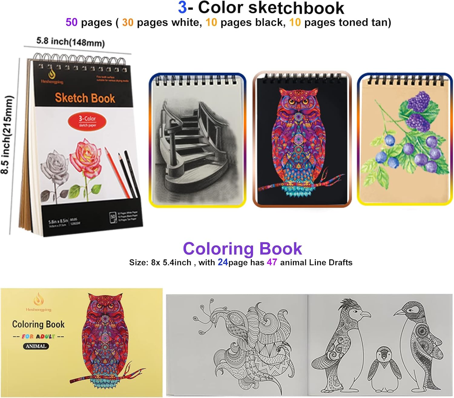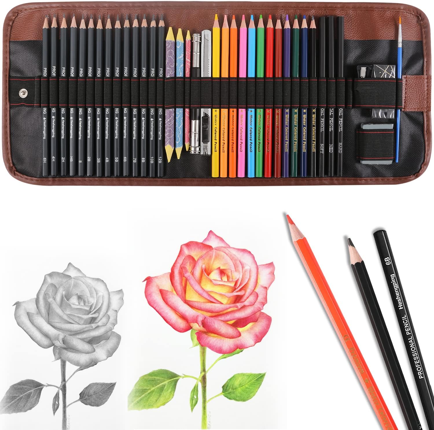 Heshengping, 41pcs Sketching Pencil Set Drawing Sketch Kit Graphite Charcoal Watercolor Pencils Blending Stumps 50page sketchbook, coloring book, Beginners Artist Teens and Adults