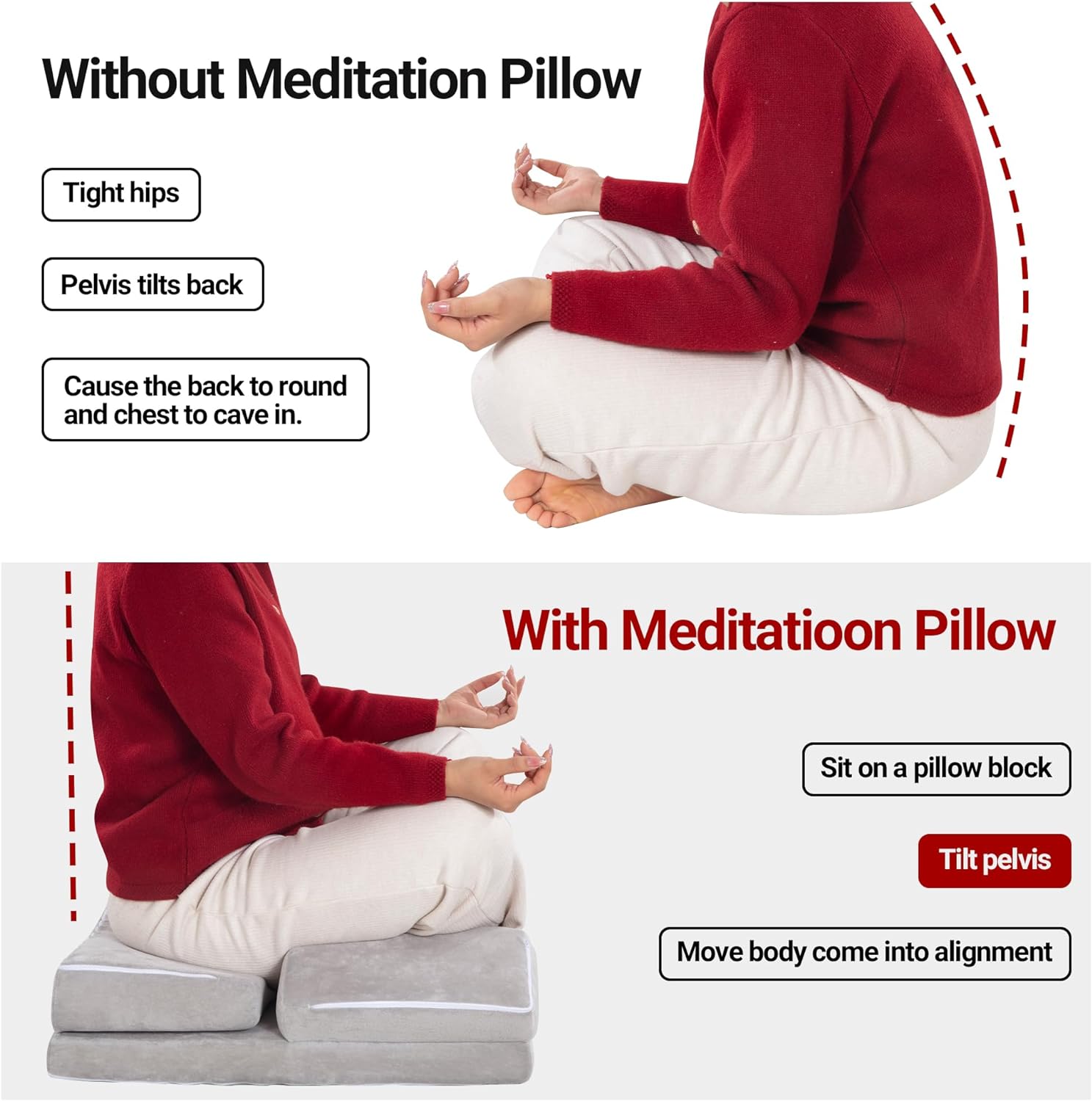 【Multi-functional Meditation Pillow】Sitting on the floor is cold and uncomfortable, you can use this meditation mat designed for yoga and meditation to help you focus on your mind and body and enjoy deep meditation. Helps you maintain proper posture while doing yoga poses or meditation. The knee and hip support cushion can relieve the pressure on your hips, knees, and meditation novices are also suitable for use, so that you can feel comfortable and peaceful while meditating or practicing yoga.