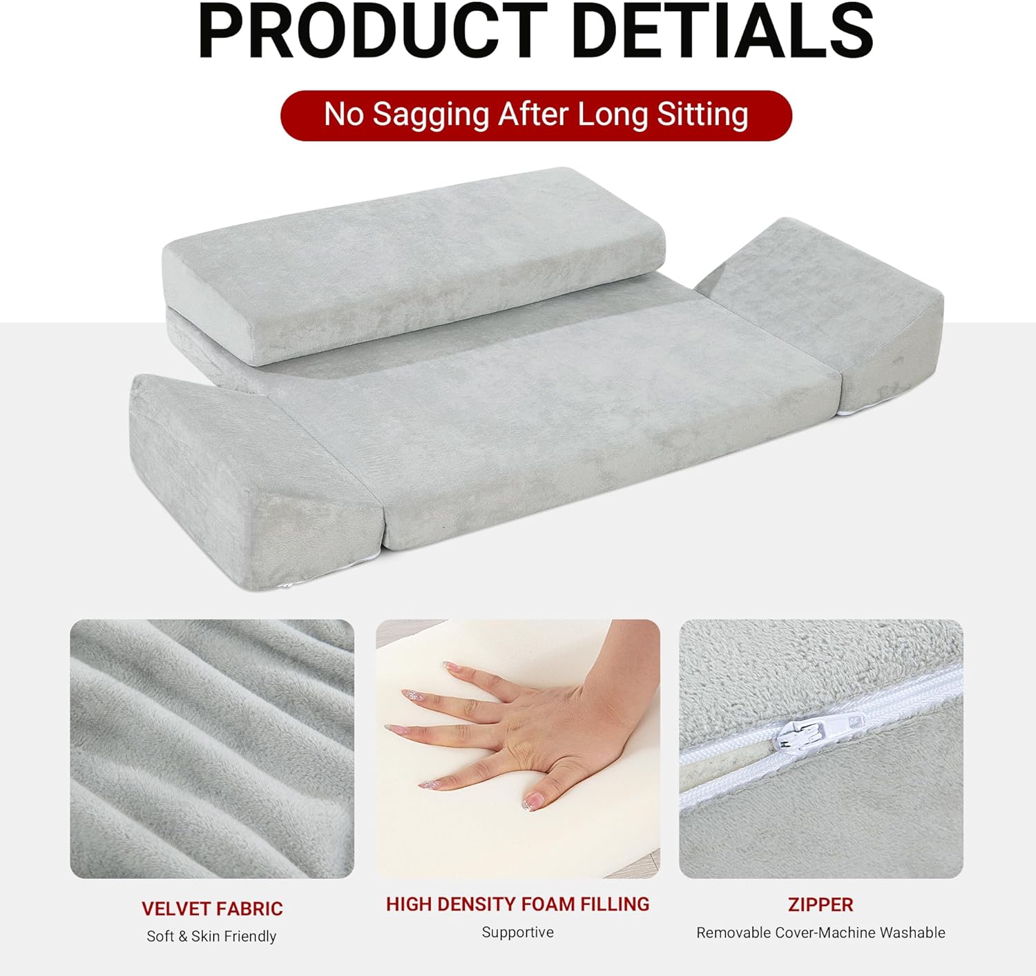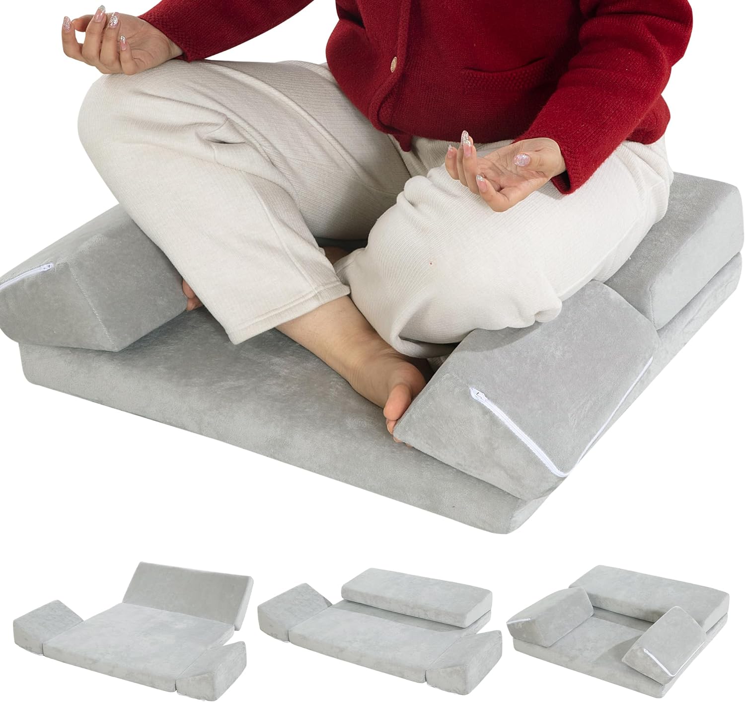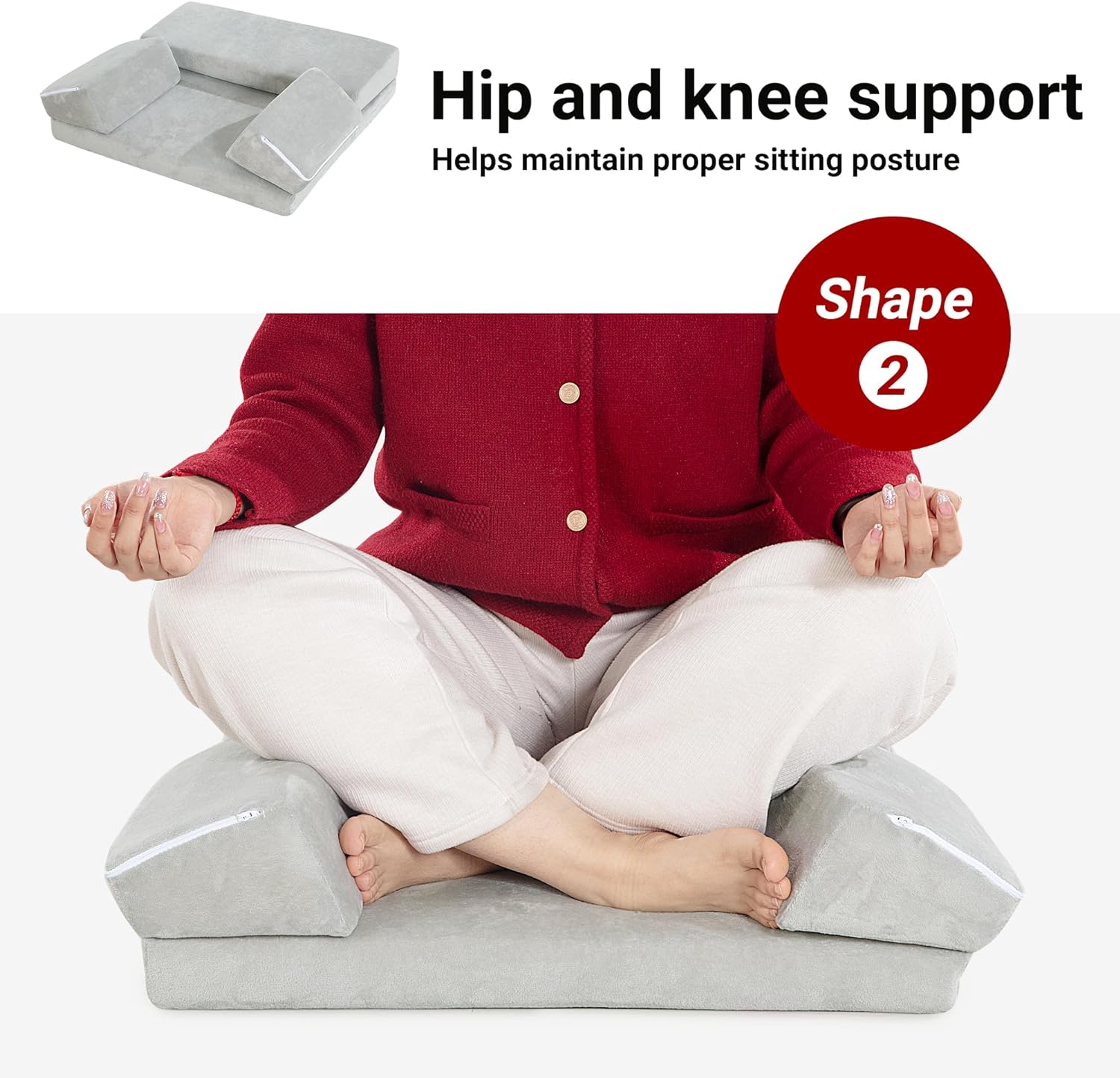 【3 Shapes】3 shapes are designed for meditators at different stages of meditation, easily change the shape by folding and lowering the knee cushion and hip support cushion. The spread base shape is designed for experienced meditators, meditation beginners can use the knee & hip support cushions.