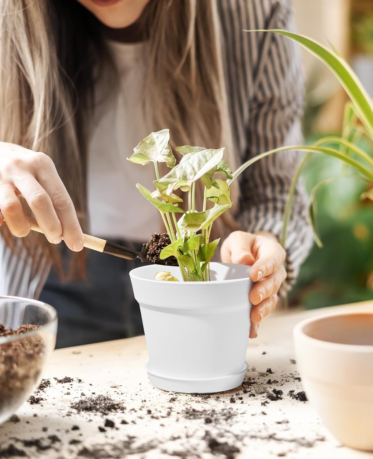 【Size of Planter Pots】Each plastic pot is 6 Inch in Opening Diameter, 4 Inch in Bottom Diameter, 5 Inch in Height. With a tray, these white planters are the best choice for growing indoor and outdoor small to medium-sized home/office plants.
