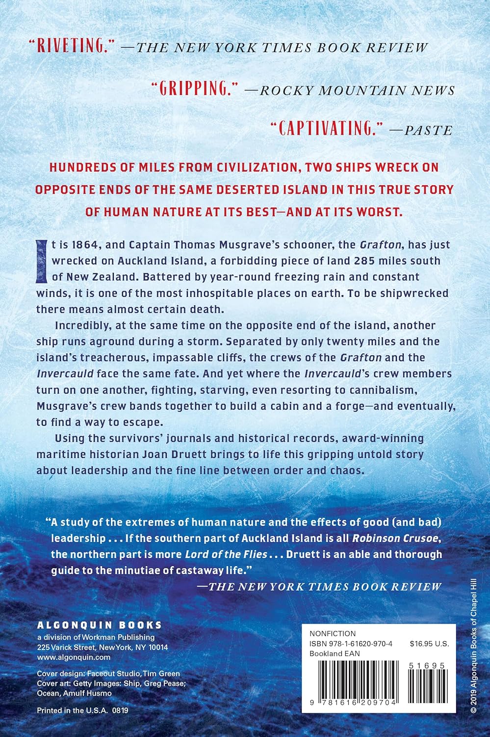 Incredibly, at the same time on the opposite end of the island, another ship runs aground during a storm. Separated by only twenty miles and the island’s treacherous, impassable cliffs, the crews of the Grafton and the Invercauld face the same fate. And yet where the Invercauld’s crew turns inward on itself, fighting, starving, and even turning to cannibalism, Musgrave’s crew bands together to build a cabin and a forge—and eventually, to find a way to escape.