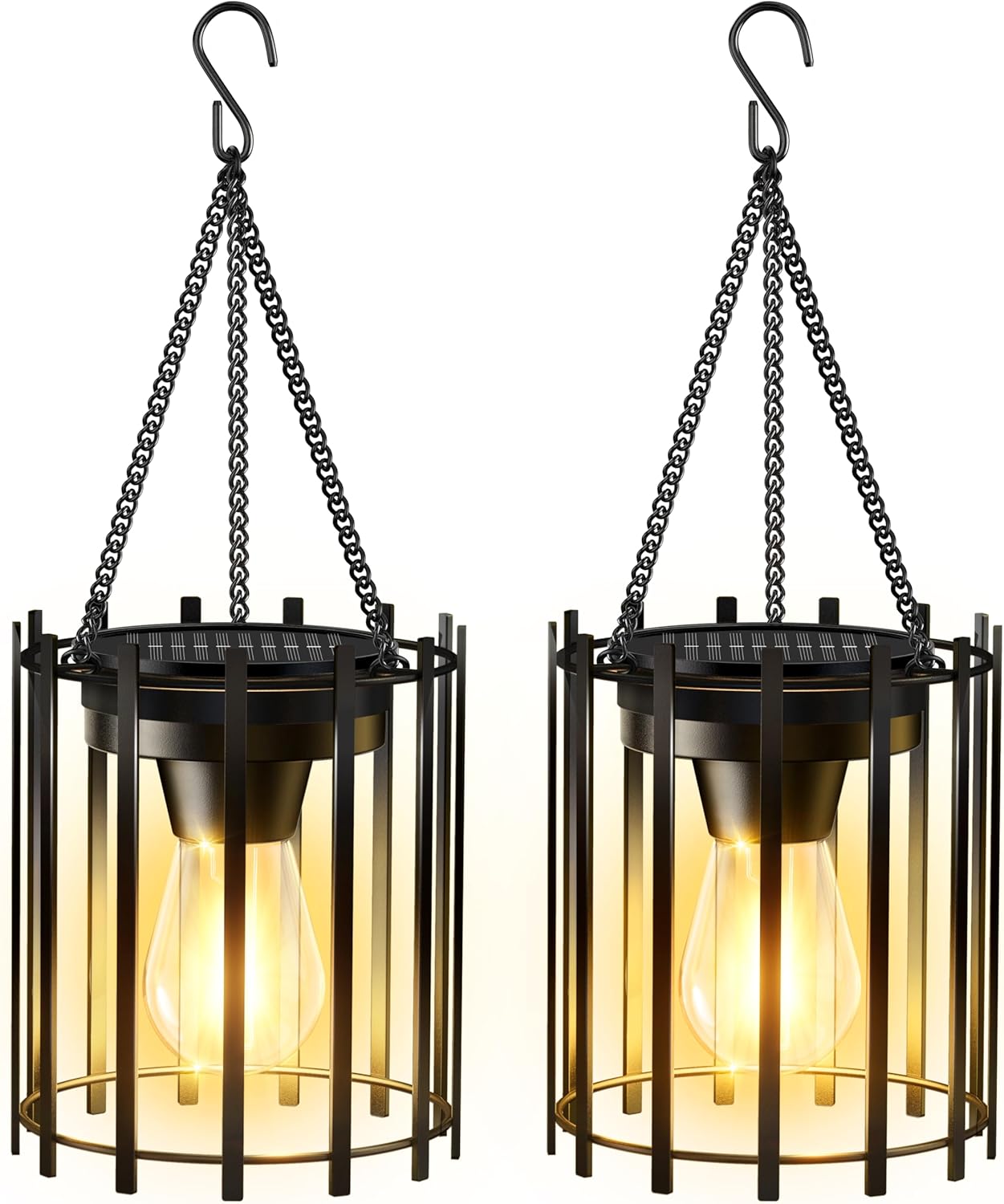 【Unique Design & Portable】 Solar lights outdoor combine a classic design with modern functionality, featuring a cylindrical shape crafted from high-quality metal that add elegance to any outdoor decor. Hanging solar lantern is high-quality and portable, with a sturdy chain and hook for easy hanging on tree branch, rope, or shepherd hook, making hanging solar lights flexible for various outdoor decor. The hanging solar lights for outside emit a warm light, creating a cozy and inviting atmosphere at night
