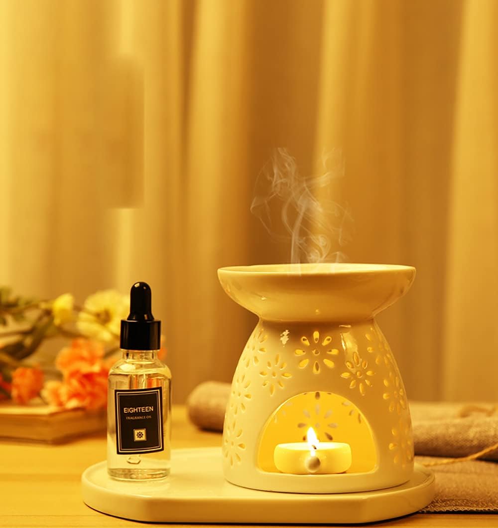 Candle Oil Burner, come with ceramic spoons. Easy to place in and out put, no more worry your finger will be hurt by the candle fire; Big mouth design effectively extends the burning time of essential oil, pleasant and clean aromas spread from the oil diffuser. Diffuse Slowly and Time LastingThe essential oil burner has beautiful cut-out floral patterns. Hollowed-out holes spreading soft light, casting beautiful patterns on wall and table. When glowing, it looks like many swaying flowers in your room