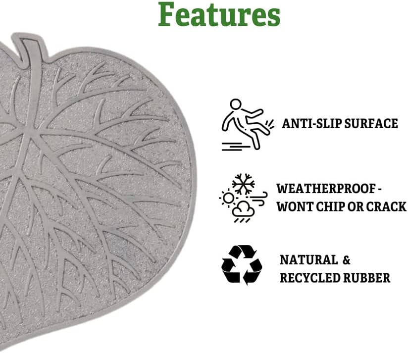 PRODUCT DETAILS: Aesthetically Beautiful and Sustainable Garden Stepping Stone Add a no-fuss walkway to your landscape with this leaf-shaped rubber paver instead of the usual stone looking pavers. Made from natural and recycled rubber blend, you can feel good about laying these eco-friendly stepping stones in your garden or lawn. **SOLD INDIVIDUALLY**