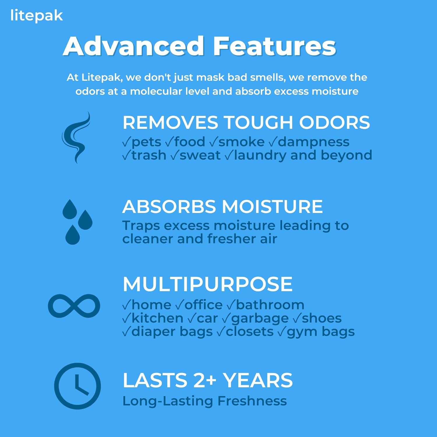 EFFECTIVE + SIMPLE: Place a Litepak Deodorizer anywhere to start absorbing unwanted odors. You’ll notice a difference within a day!