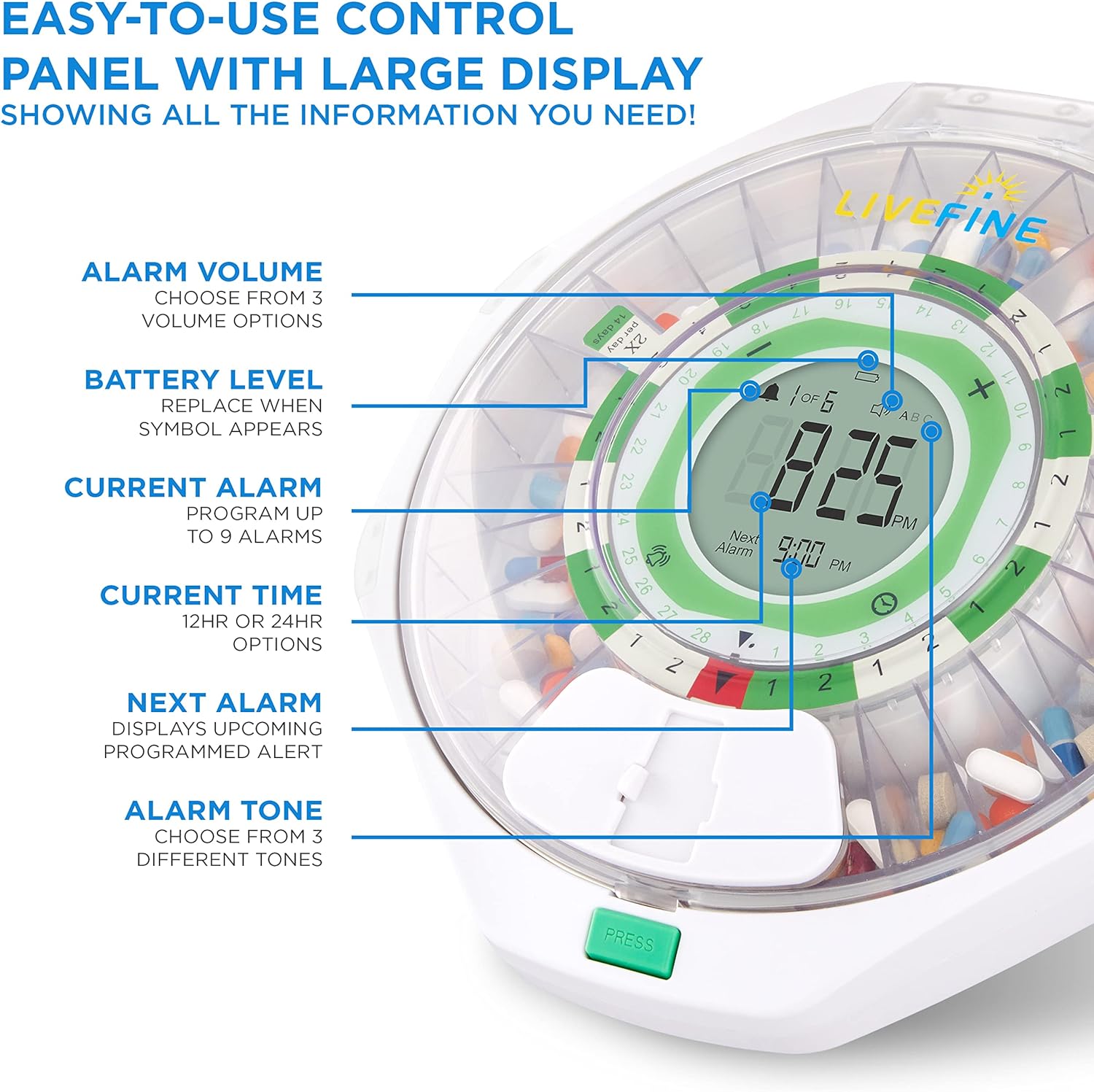 Live Fine 28-Day Automatic Pill Dispenser Clear Lid with Upgraded LCD Display and Key Lock, Sound & Light for Prescriptions, Medication, Vitamins, Supplements & More