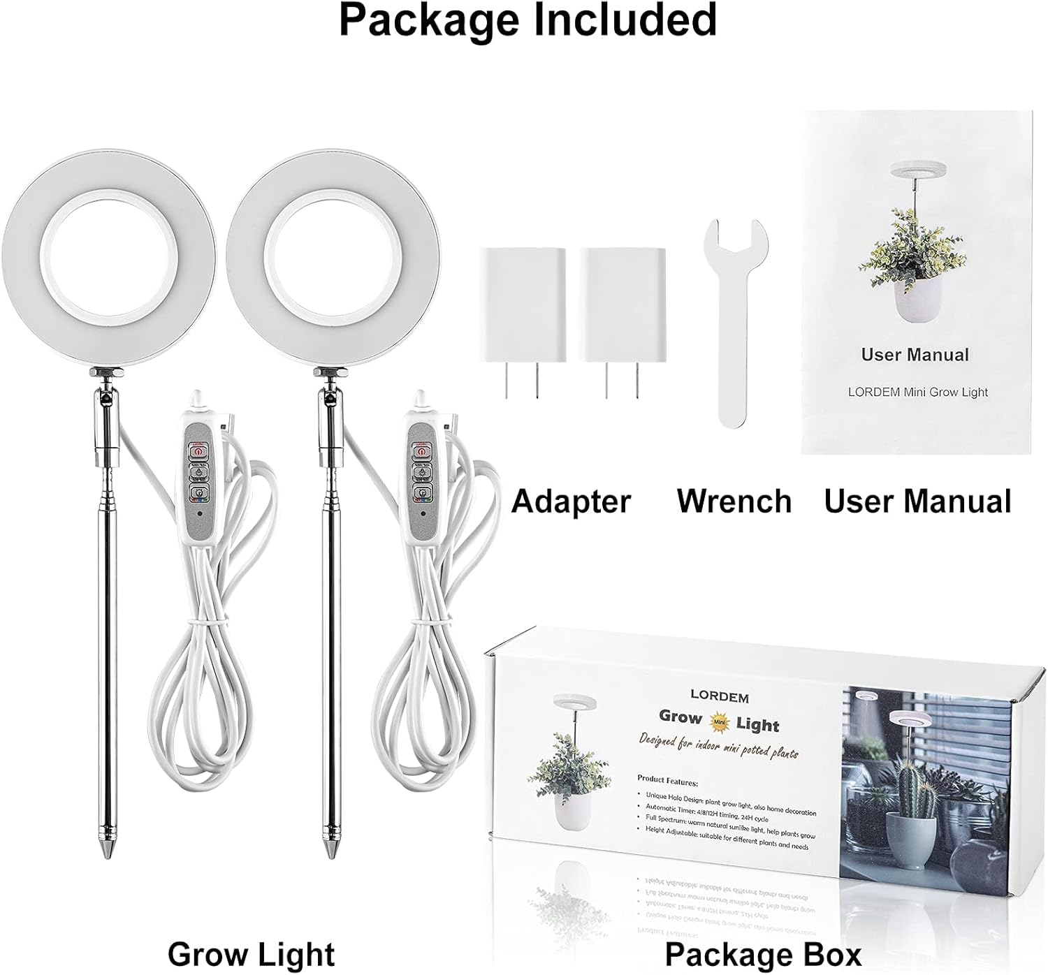 LORDEM Grow Light, Full Spectrum LED Plant Light for Indoor Plants, Height Adjustable Growing Lamp with Auto On/Off Timer 4/8/12H, 4 Dimmable Brightness, Ideal for Small Plants, 2 Packs