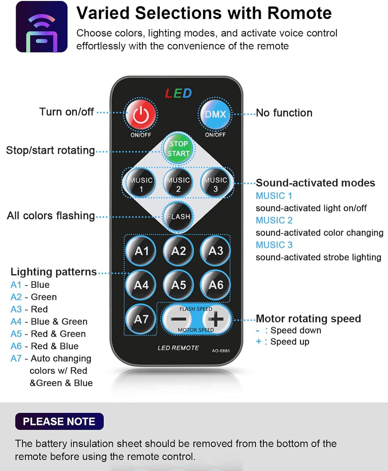 Multi-functional sound activated party lights: 3 sound-activated modes + 7 lighting modes + Rotating speed control