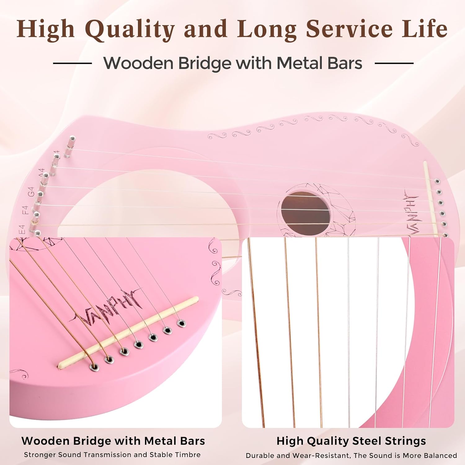Lyre Harp VANPHY Lyre Harp 7 Strings Mahogany Body Metal String for Beginner Harp Classical Style Harp Instrument with Tuning Wrench Strings Songbook Gig Bag (Pink)