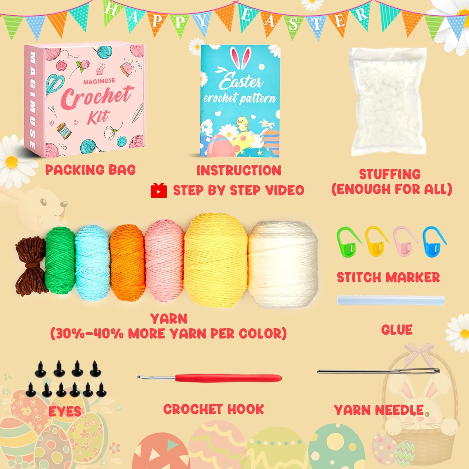 🥚All-In-One Crochet Starter Kit: MAGIMUSE Easter crochet kits comes with everything you need to create adorable. Bunny family bunny/chick/egg, includes beginner-friendly instruction and video, enough 7 color yarn, stuffing, eyes, ergonomic Crochet Hook, yarn needle and stitch marker. With all the necessary tools conveniently packaged together, you can save time and effort by not having to search for each component individually.