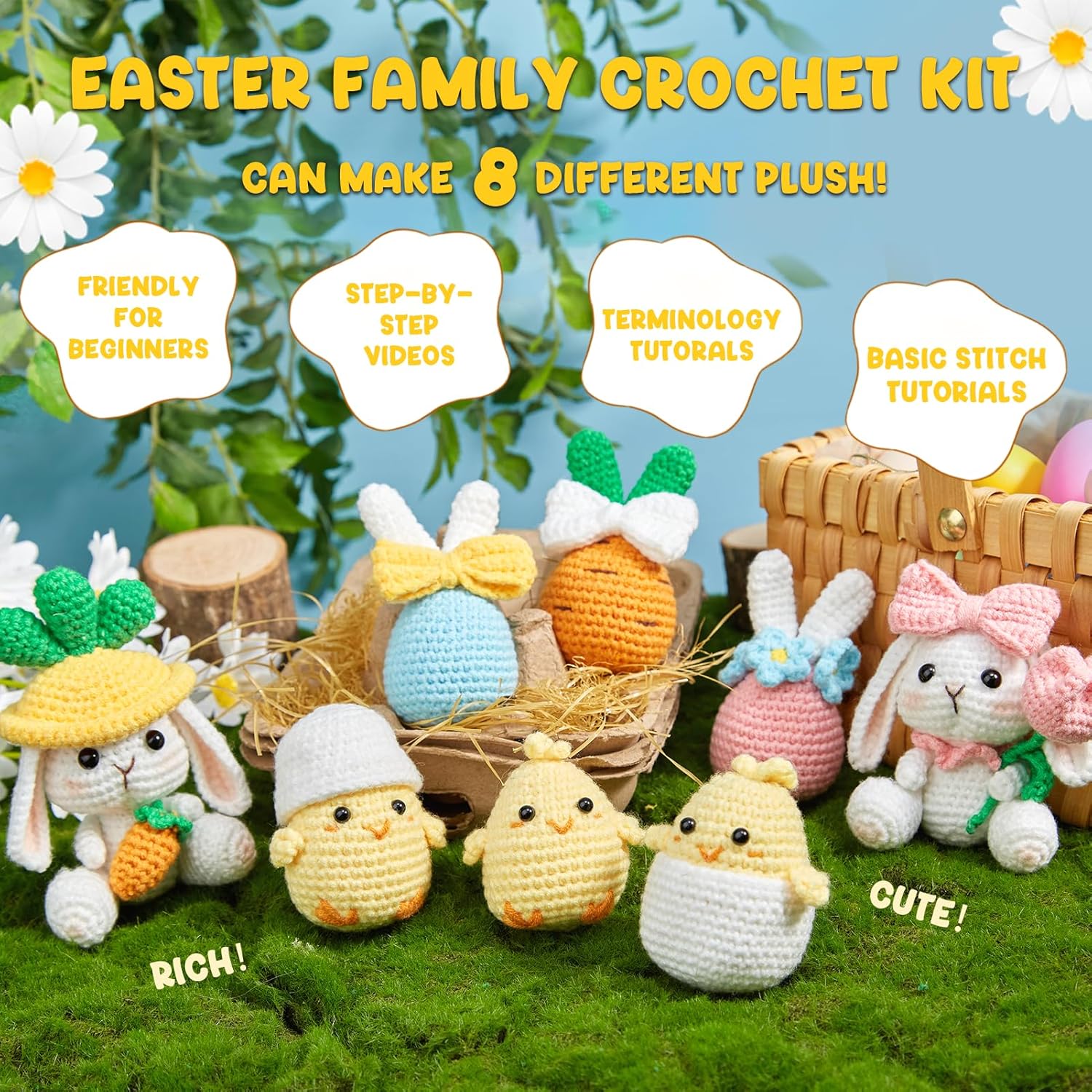 MAGIMUSE Crochet Kit for Beginners, Crochet Starter Kits for Adults Amigurumi Craft Knitting Crochet Animals Kits w Step-by-Step Video Tutorials, Easter Bunny/Chick/Eggs(40%+ Yarn)