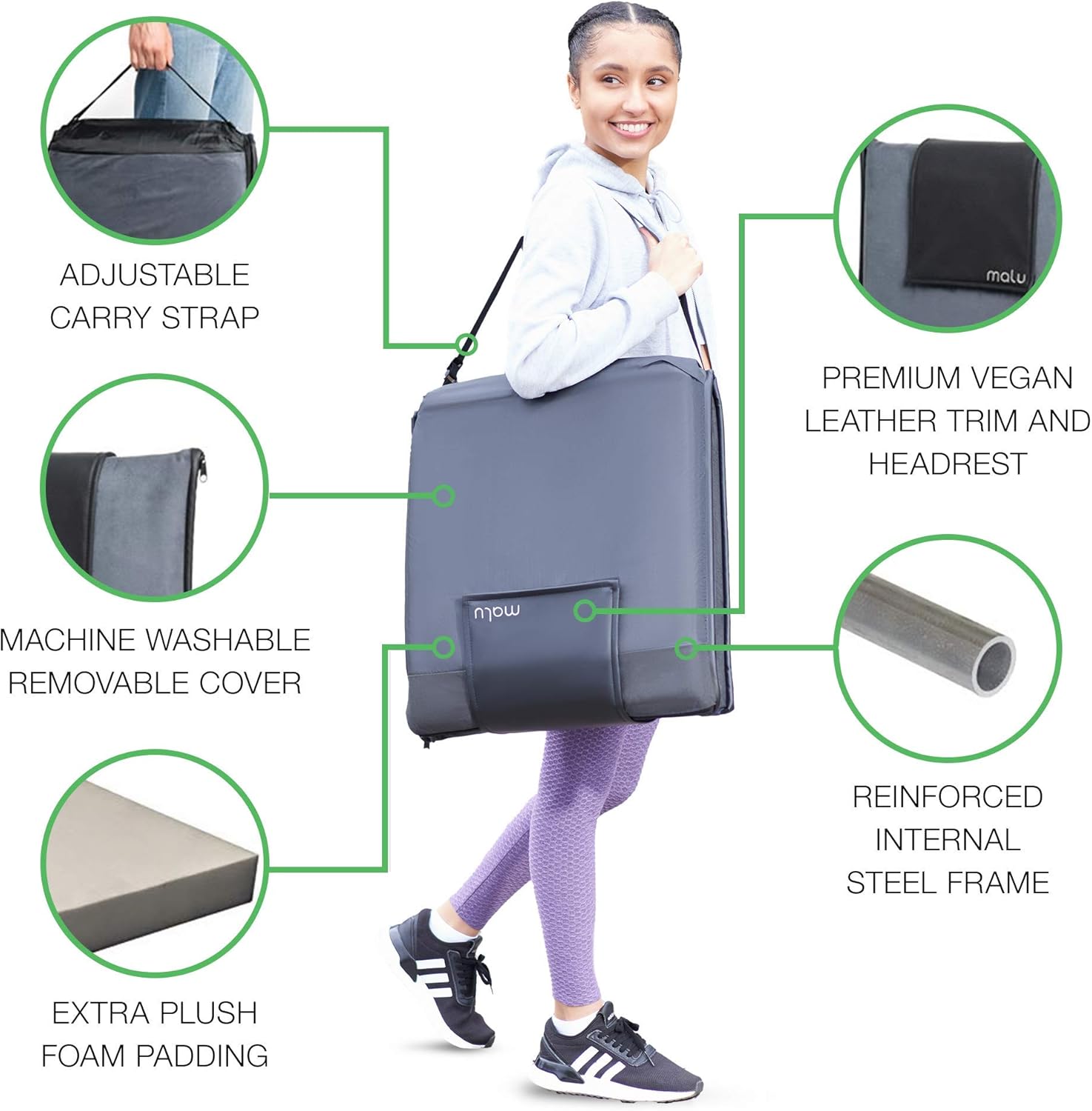 The Malu floor chair’s pragmatic adjustable strap and light-weight body makes it so easy to carry around!