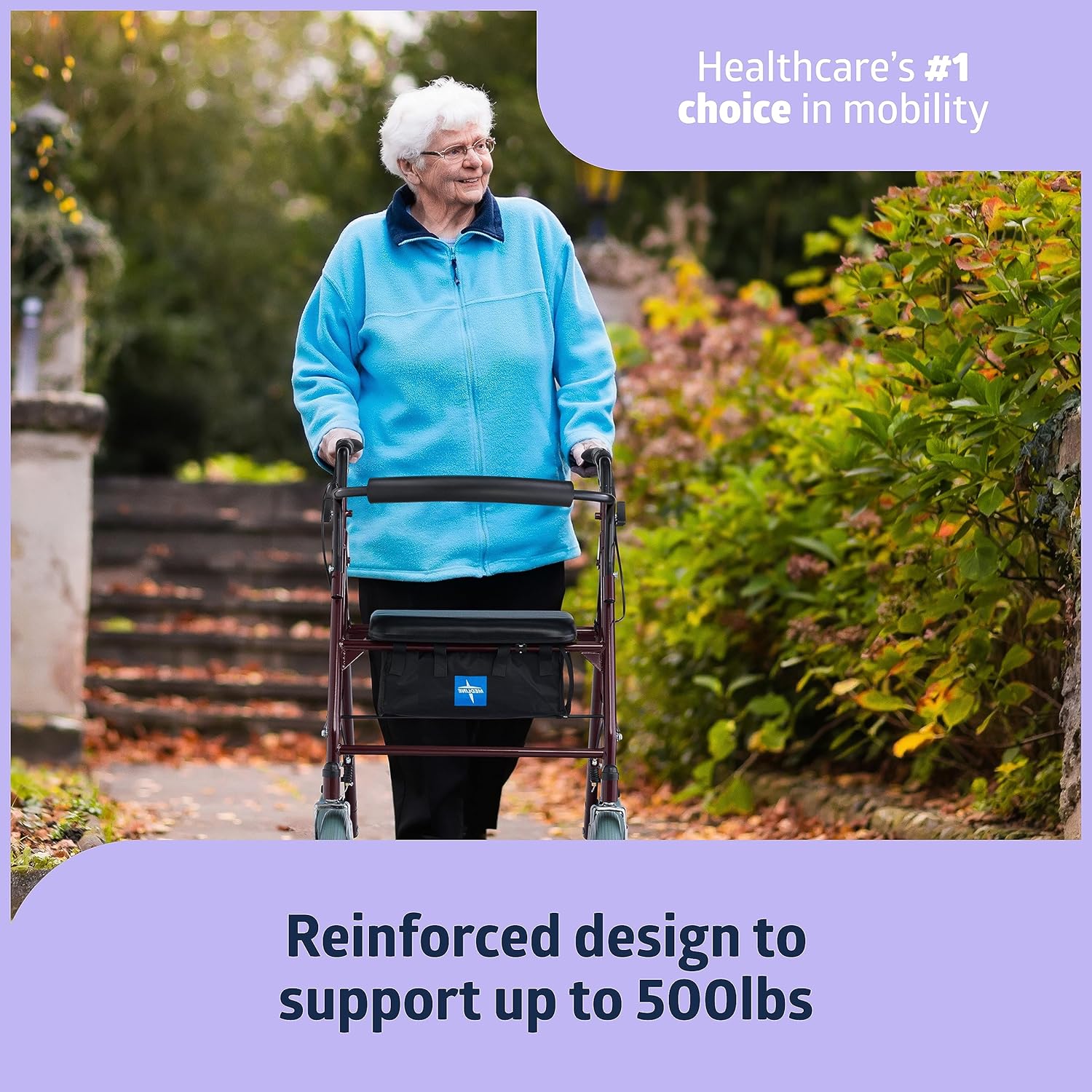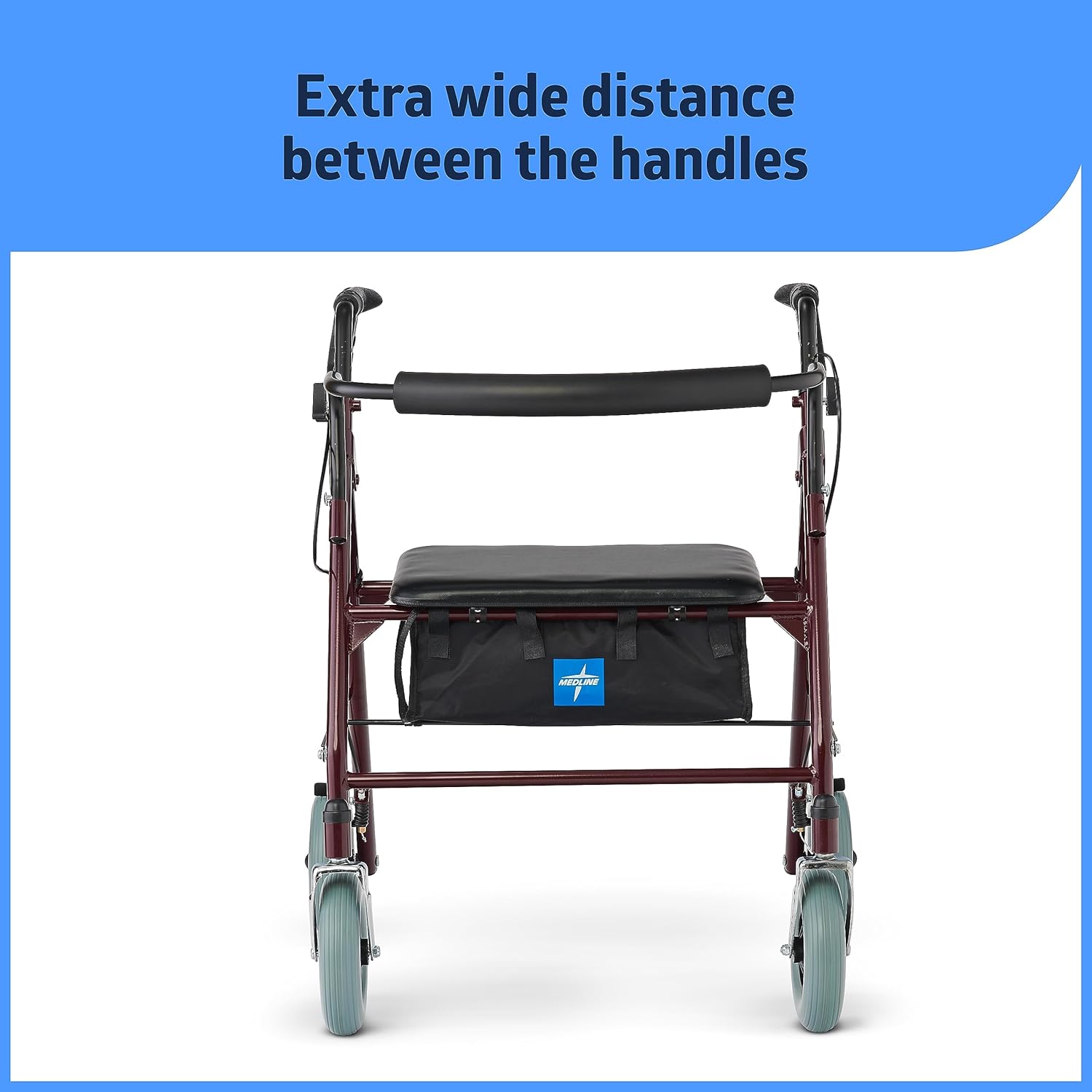 Strong, comfortable, and maneuverable. Made by Medline, the leader in mobility and bath safety aids, this bariatric heavy-duty steel rollator features a reinforced frame, padded backrest and seat with large premium wheels, locking brakes and a high weight capacity for durable, reliable support and greater freedom and mobility.