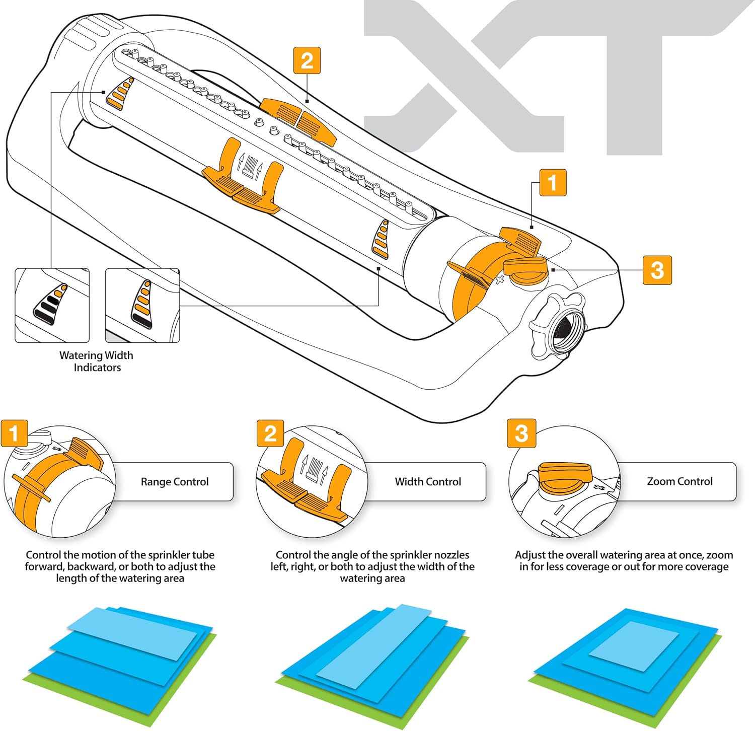 Zoom Control adjusts the overall watering area. Zoom in for a small patch of newly seeded lawn or all the way out to cover a large section of the yard.