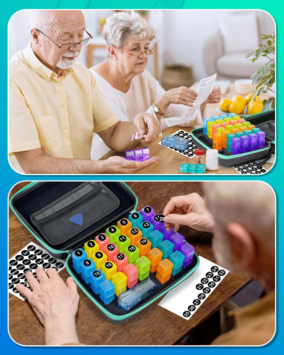 Travel Pill Organizer: 31-day case with handle, hands-free travel. Protects meds on the go, ideal gift for family members. Includes 31 pillboxes, cutter, mesh bag, stickers, EVA case.