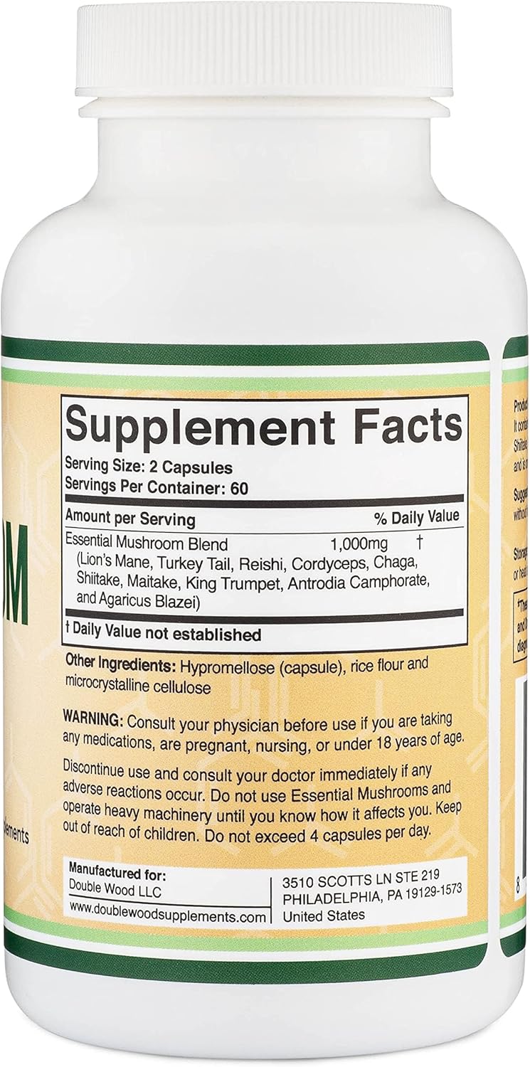 10 OF THE MOST ESSENTIAL MUSHROOMS: Double Wood’s Mushroom Complex contains equal parts Lion’s Mane, Turkey Tail, Reishi, Cordyceps, Chaga, Shiitake, Maitake, King Trumpet, Antrodia Camphorata, and Agaricus Blazei
