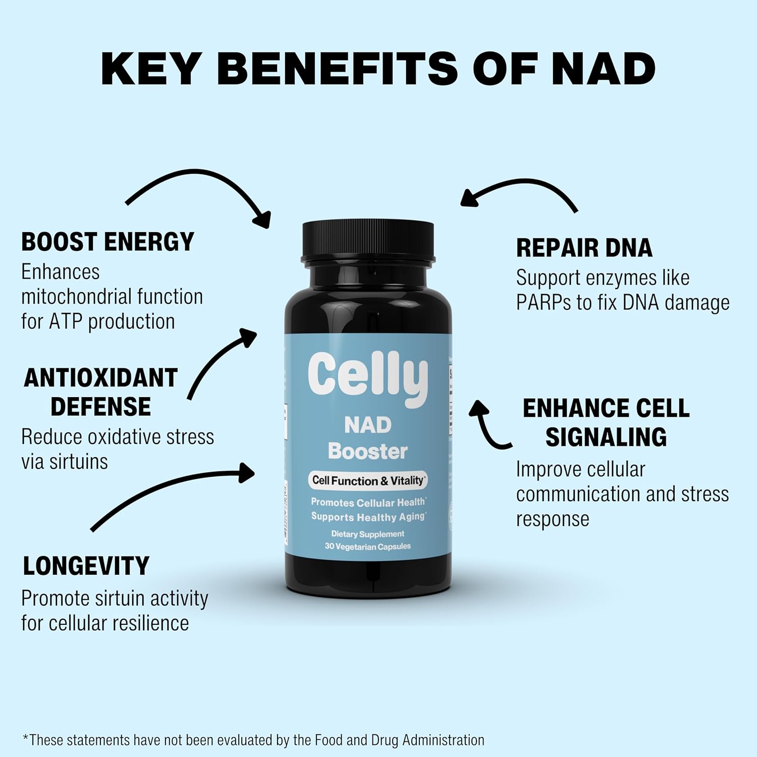 Enhances Cellular Vitality: Celly NAD Booster elevates NAD levels to support energy, cellular repair, and healthy aging with one daily capsule.