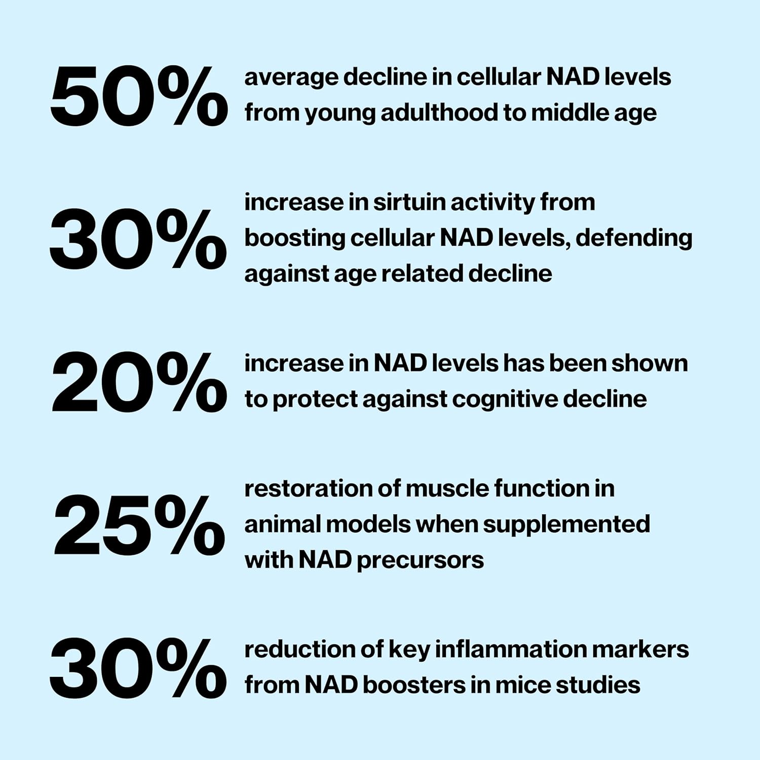 Powerful NAD Support: Features Nicotinamide Riboside (NR) and Vitamin B3 (Nicotinamide) to boost NAD production for improved mitochondrial function and cellular metabolism.