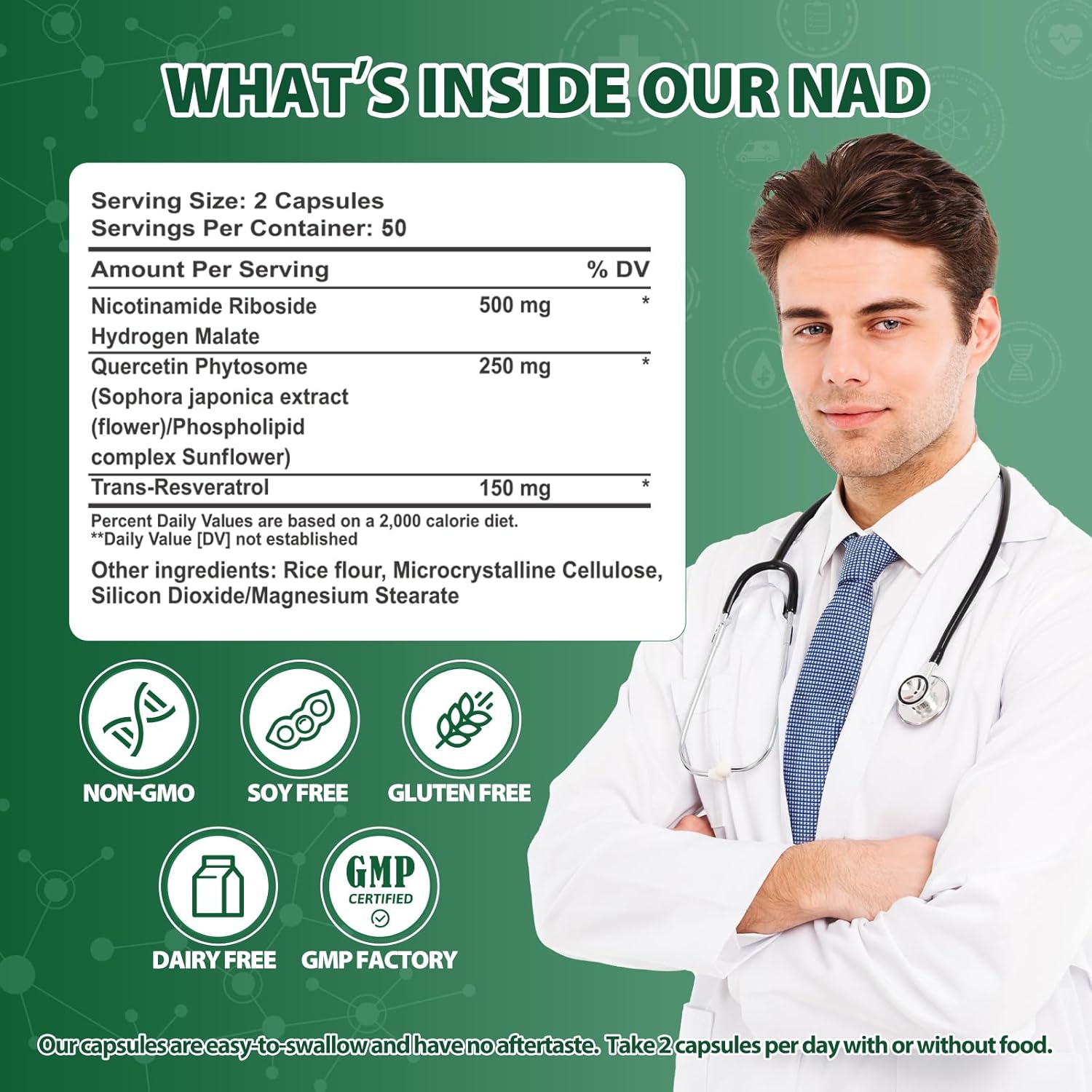 Premium NAD+ Formula: Our NAD+ Resveratrol supplement contains Nicotinamide Riboside, Quercetin PhytoCapsule, and Resveratrol. Take two NAD capsules daily for maximum health benefits!