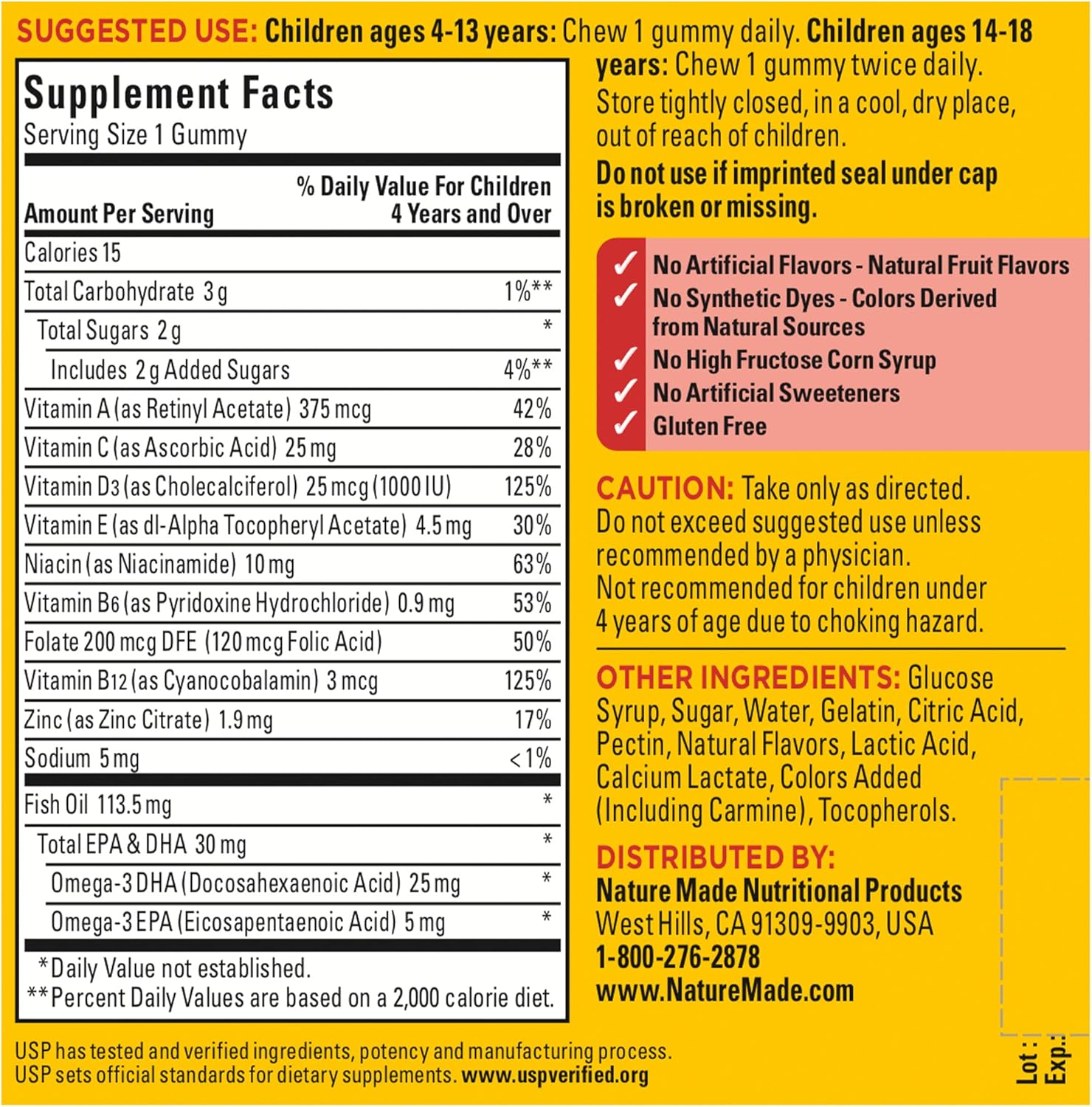 Children ages 4-13 chew one of these Nature Made multi gummies daily, and children ages 14-18 chew one of these kids multivitamin with Omega 3 gummies twice daily