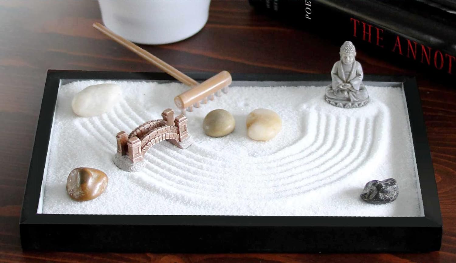 8 reviews for Nature’s Mark Mini Zen Garden Kit for Desk with Rake, White Sand, Buddha Figures, Bridge Figure and River Rocks, Black Rectangle Base