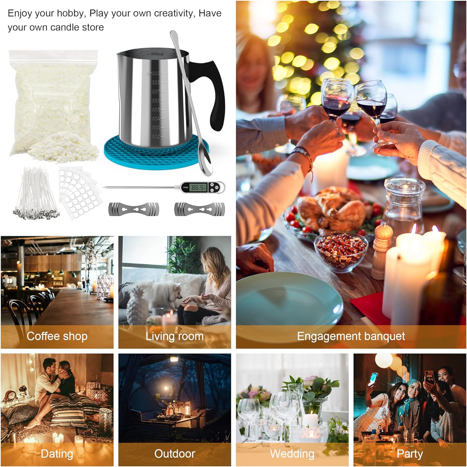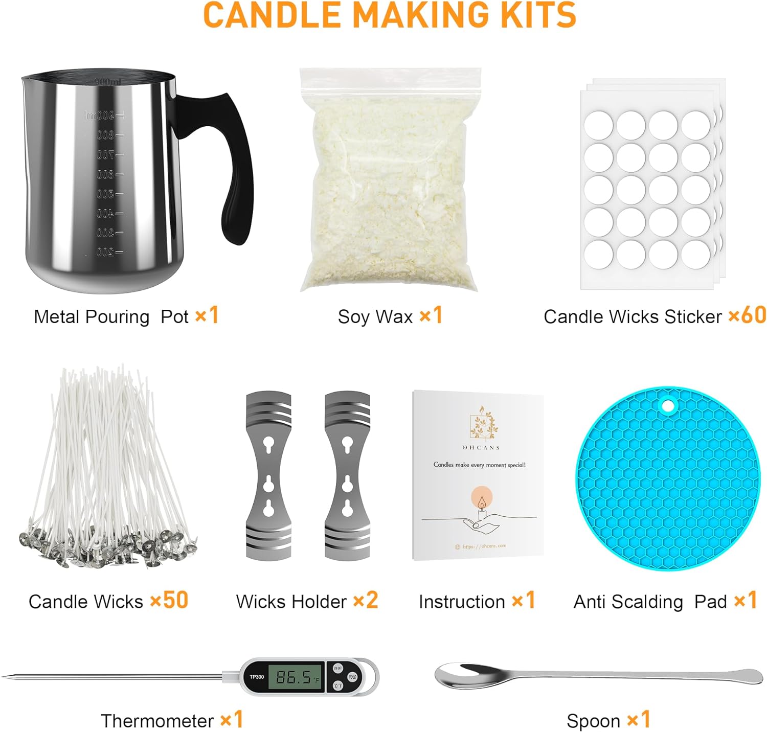 【CANDLE MAKING KIT】900ml 304 Stainless Steel Candle Pouring Pot x 1,Anti-hot silicone mat x1 , 12.4oz soy candle wax x1 , 5.1” Candle Wicks x50, Candle Wicks Sticker x60, Stainless Steel Wicks Holder x2 , Thermometer x1, Spoon x1 , DIY candle making kit supplies suit for beginners