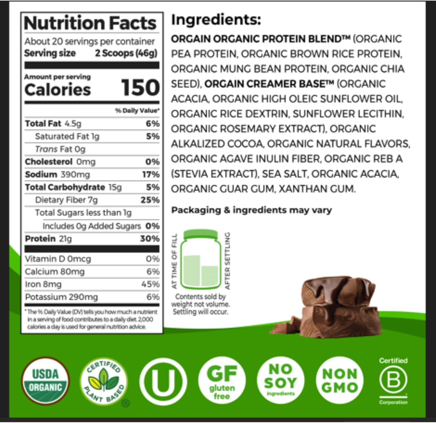 WHAT TO EXPECT: Includes 1 (2.03 Lb) (20 Servings) ready to mix Orgain Organic Creamy Chocolate Fudge Protein Powder. Each serving contains 150 Calories (2 Scoops).