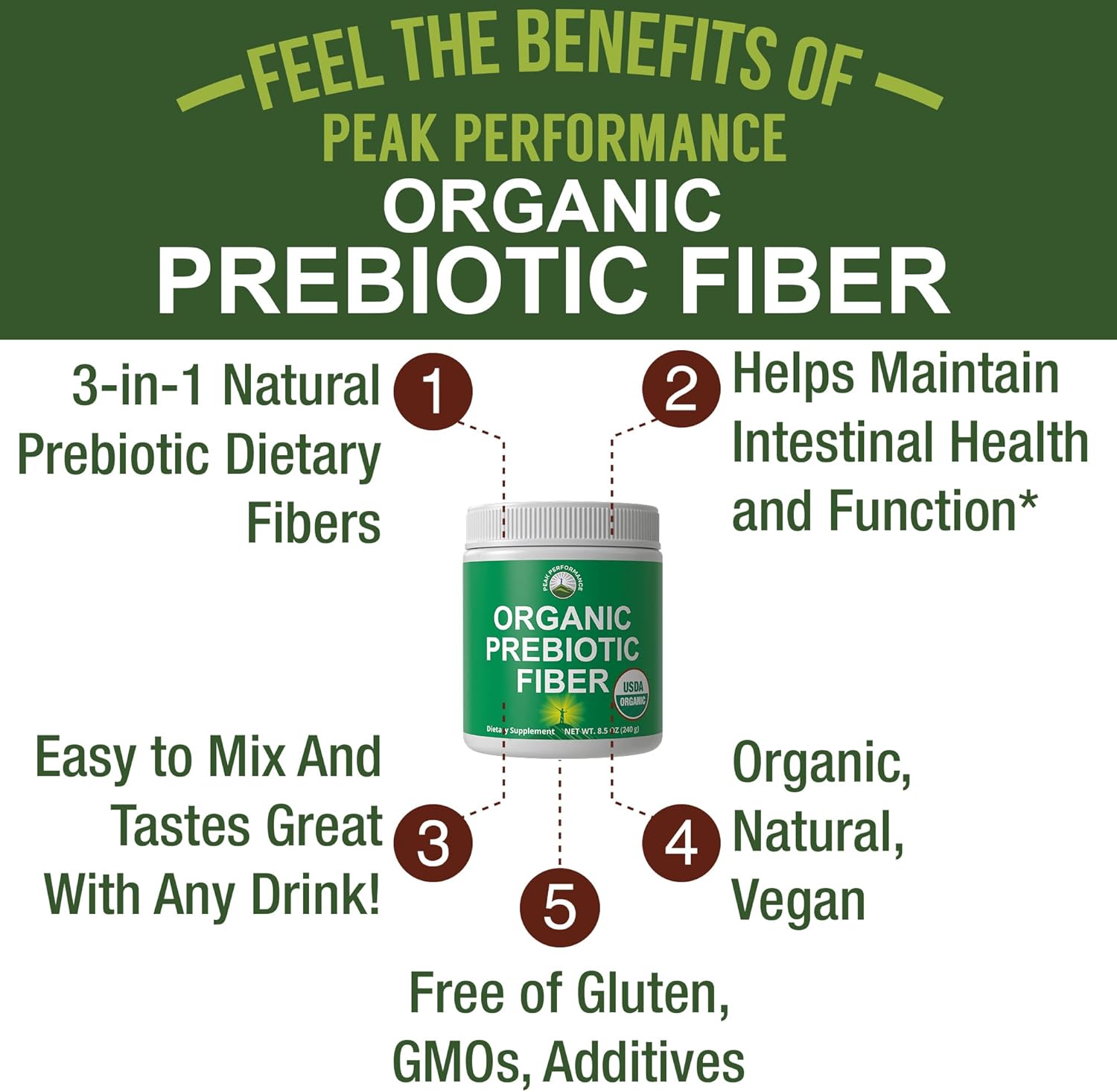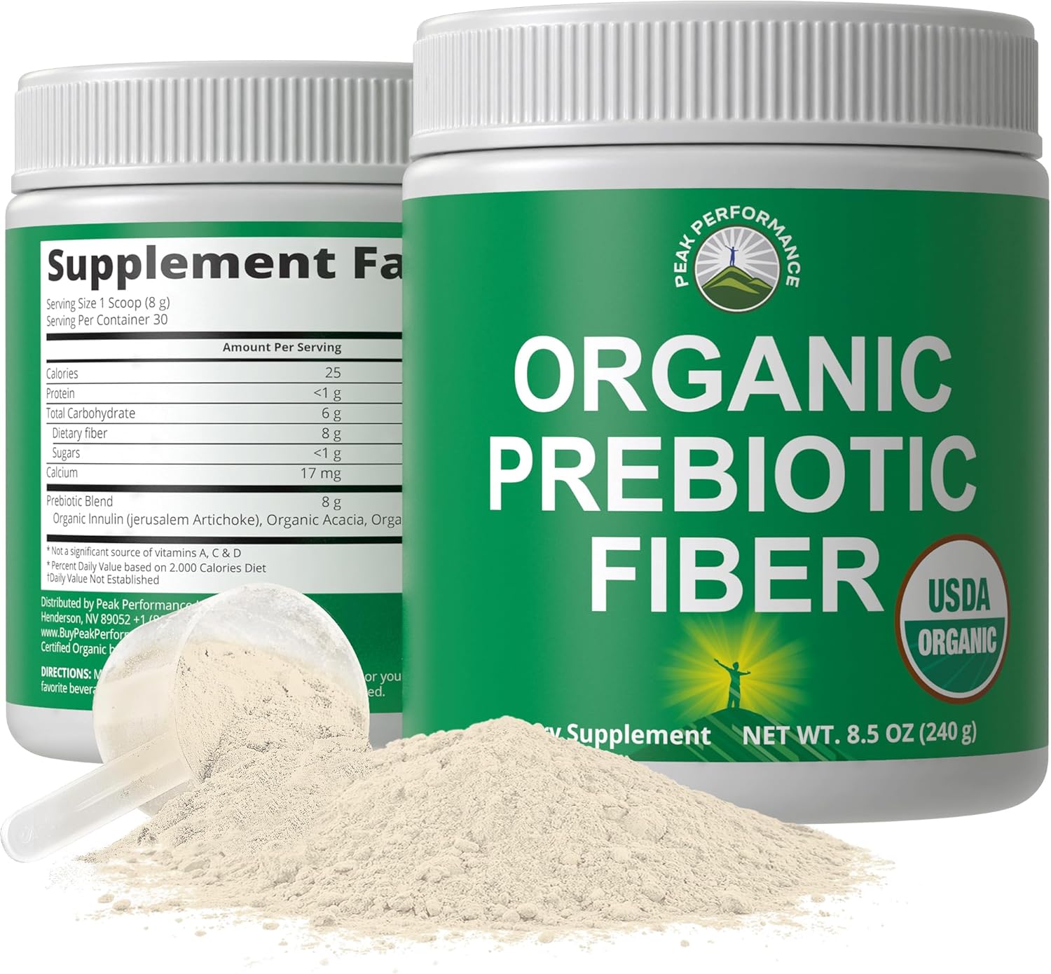 Not all prebiotic powders are created equal! Many fiber supplements contain non-organic, insoluble “bulking” fibers. Peak Performance Organic Prebiotic Fiber is an all plant-based vegan soluble powder supplement that blends with water in the gut. Helps prevent leaky gut and speeds the passage of food and waste through your gut. Great for men and women.