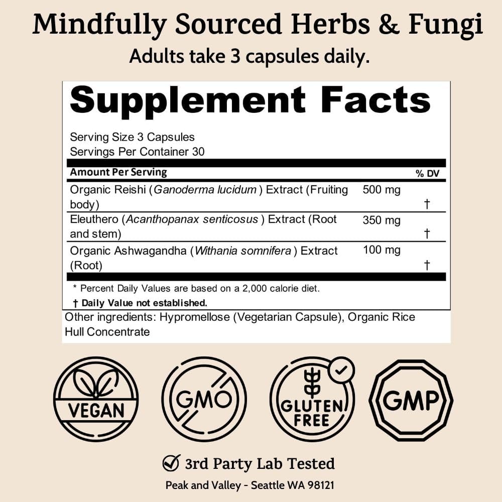 Tested and Certified: This adaptogens supplement is manufactured in a GMP, ISO22000, HACCP, and Organic certified facility. Like all Peak and Valley products, the stress supplements for women are 3rd party lab tested for identity, purity, and labeled potency.