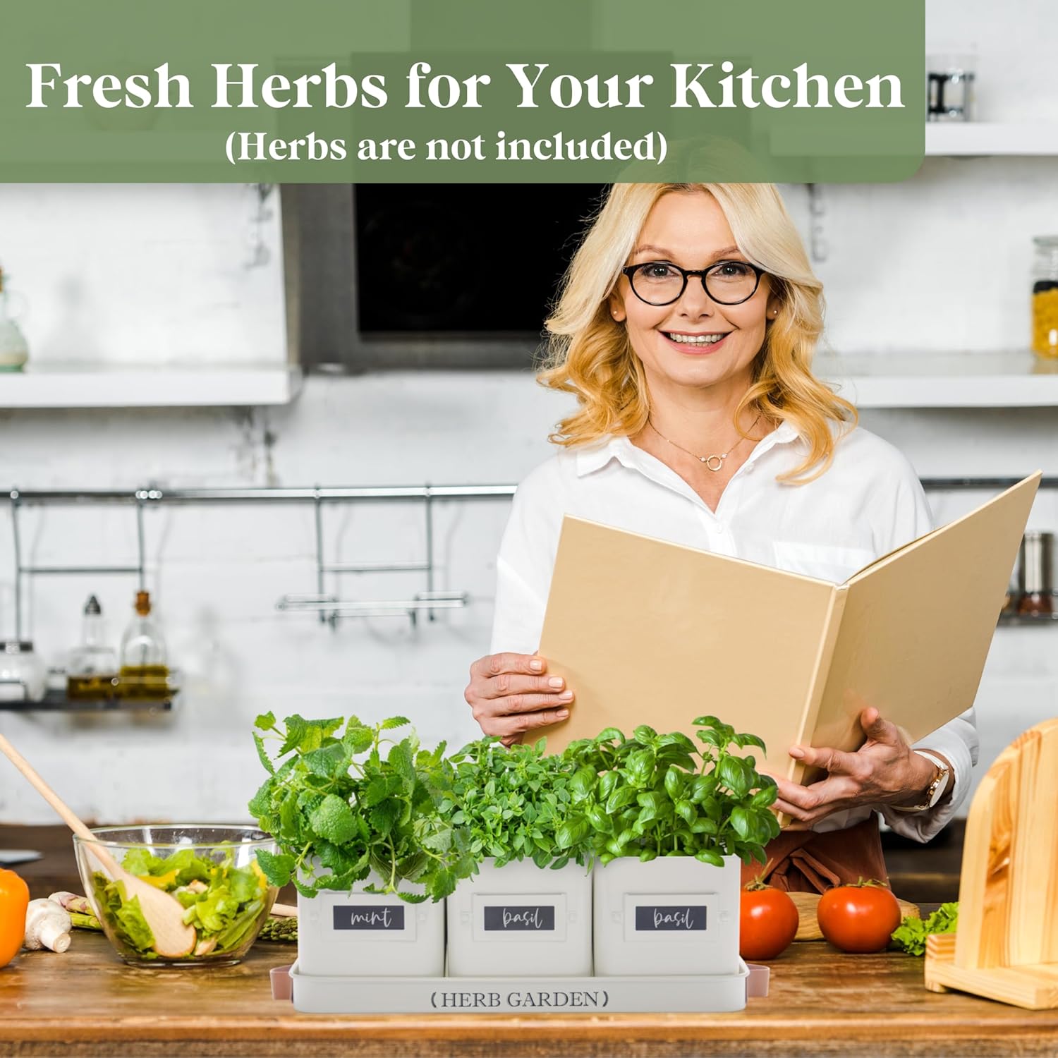 【Windowsill Herb Garden】Our window herb garden includes three pots and a tray with a handle, with each pot measuring 4.4″ W x 4.7″ H, and the tray measuring 14.2″ L x 4.9″ W x 1.2″ H. It’s ideal for growing a variety of herbs such as mint, rosemary, basil, thyme, etc. Tailored for herb growth, our indoor herb pots provide an optimal environment for nurturing your herbs. Their farmhouse design and compact size make them perfect for placement on a windowsill or kitchen countertop.