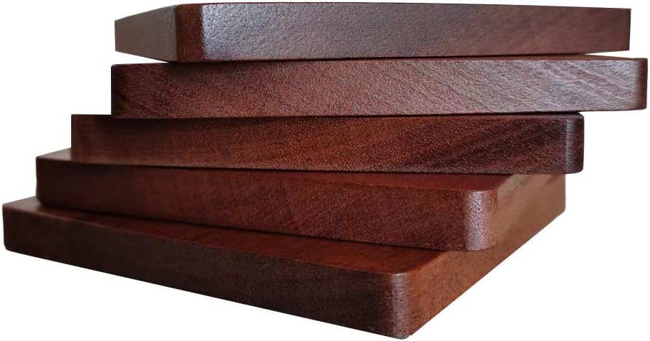 I am pleased with this purchase. I like the quality of the wood and stain; the thickness of the coaster is good; the craftsmanship is perfect; and the size of each coaster is over-sized to handle larger cups/mugs; I like that the five coasters came with a holder. The circular felt pegs, for placing on the bottom of each corner of the coasters, has good adhesive and is a pleasant bonus to protect the surface. Although I wish it was at least six coasters, I would buy again. When shopping for similar products, the others were more expensive, and didn’t include the coaster holder, felt pegs, and was not as thick.