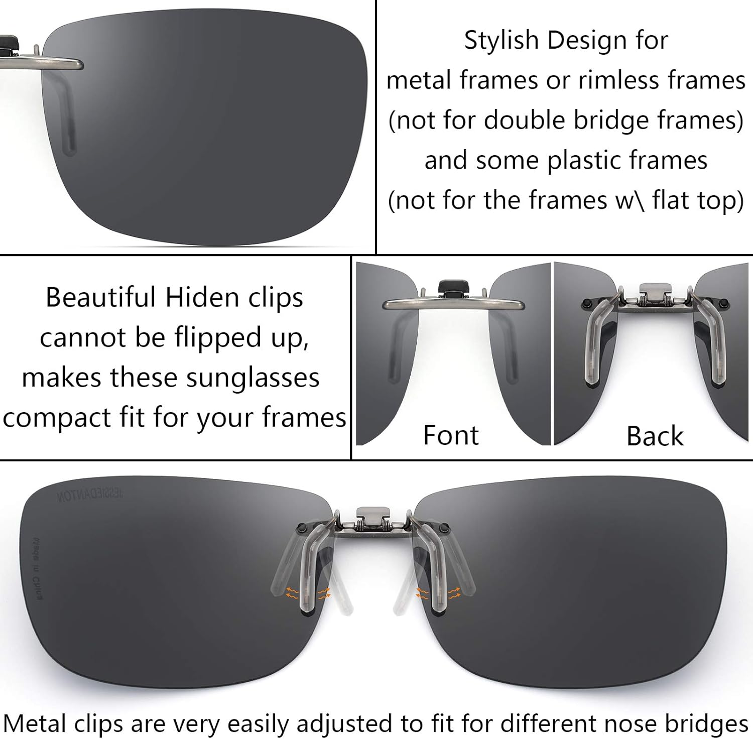 Due to the non flip up feature metal clips, these clip on sunglasses will have a compact fit for your frames, no more gap between frames and these clip on sunglasses