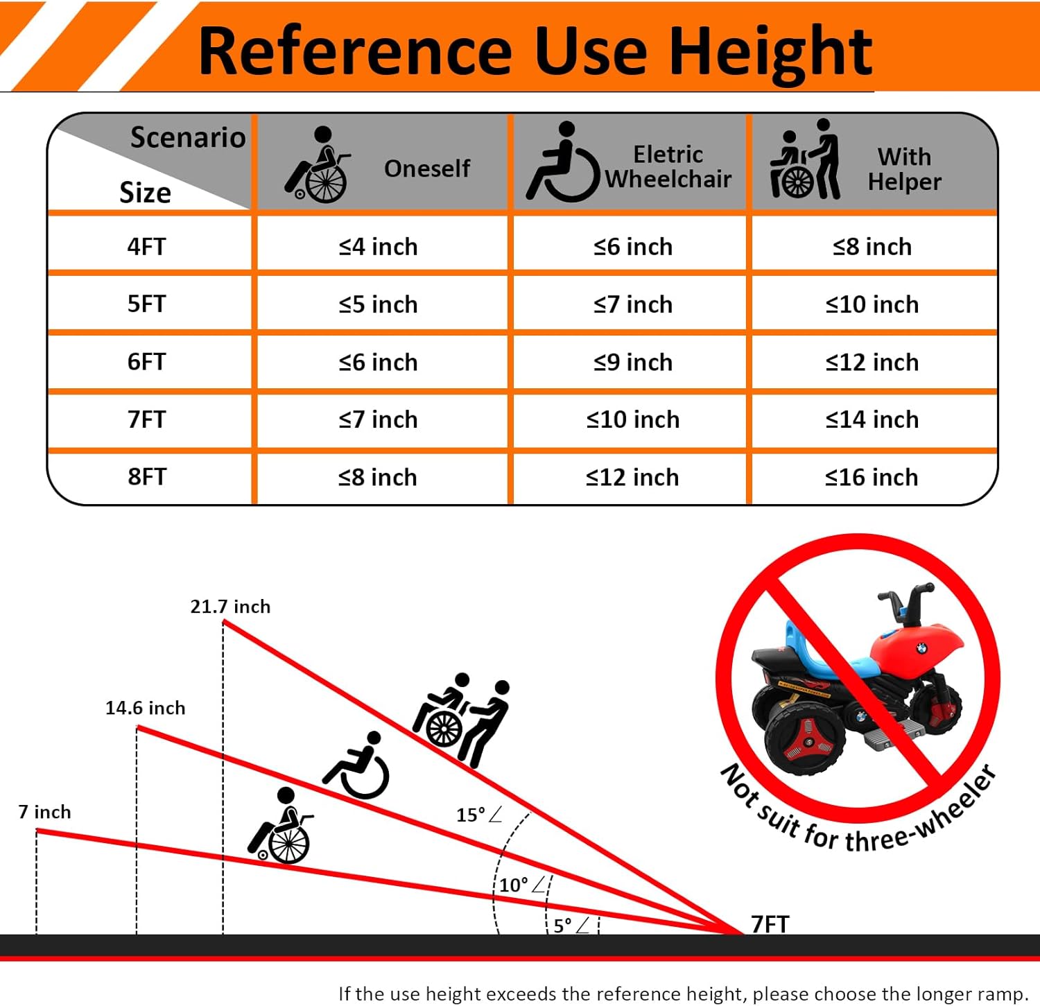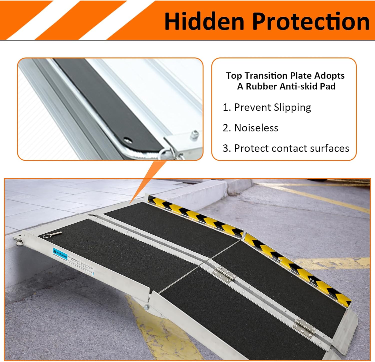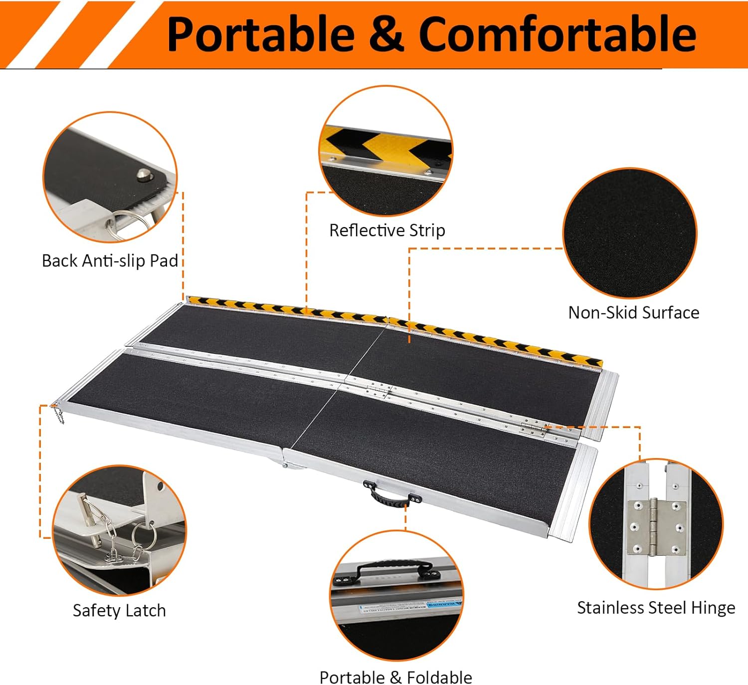 Safe to Use: Aluminum material make this handicap ramp firm and light and easy to carry and storage. Both sides of the wheelchair ramps are equipped with baffles and yellow reflective strips to prevent accidental falls. The transition plates (with rubber anti-slip pads) at the top and bottom of the ramp make the ramp better fit the ground.