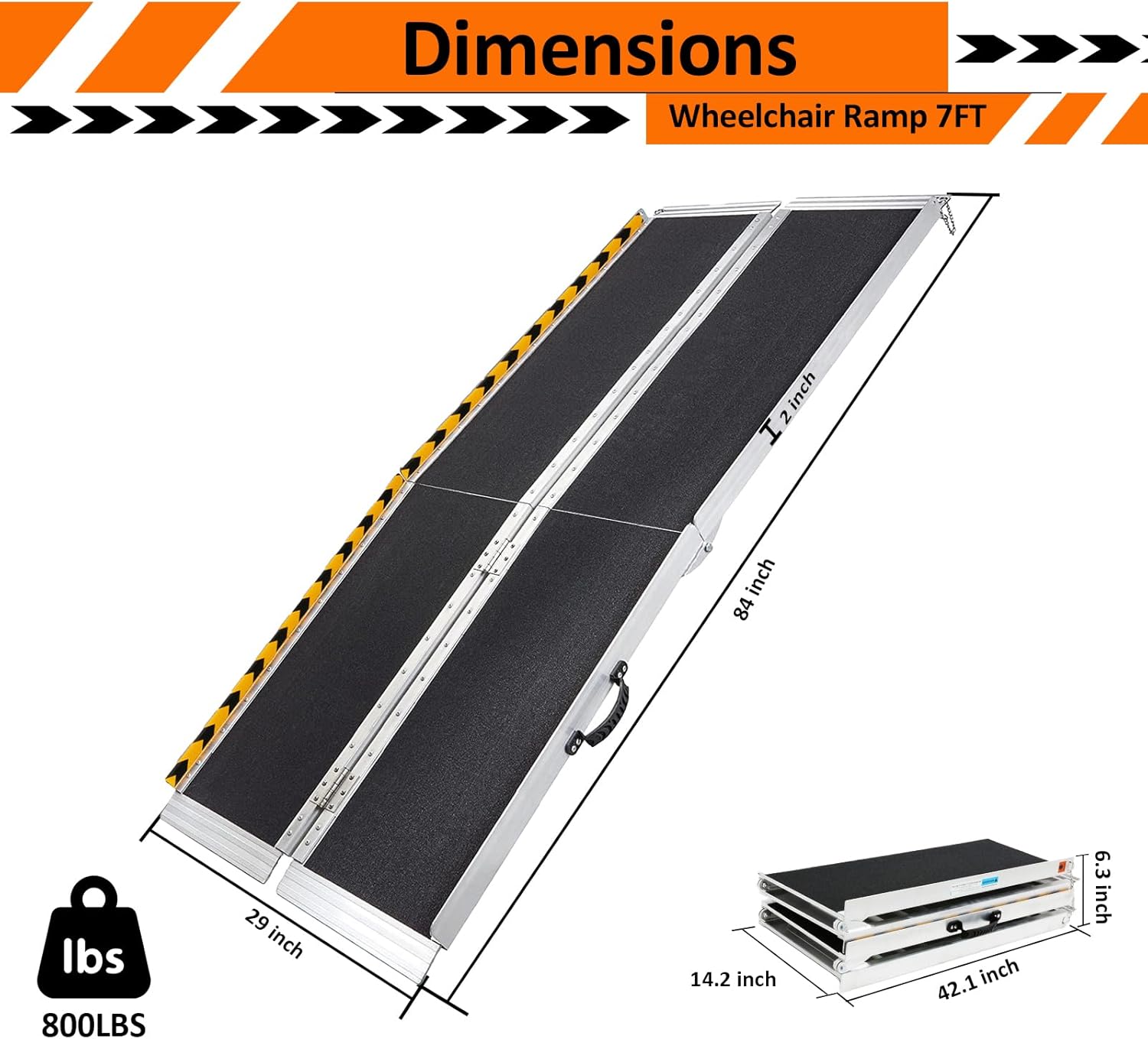 Wide Range of Applications: The capacity of the portable ramp for wheelchair for home steps is 800lbs. There are optional length for porches, curbs, landings, steps, thresholds, sheds, stairs, doorways. They can be used not only for scooters, bicycles, motorized wheelchair ramps, but also for load minivans, cars or even pickup trucks. Available in lengths of 4ft, 5ft, 6ft, 7ft, 8ft. 7FT: Unfolded size: 84″ x 29″ x 2″, Folded size: 42.1″ x 14.2″ x 6.3″, weight: 44lbs.