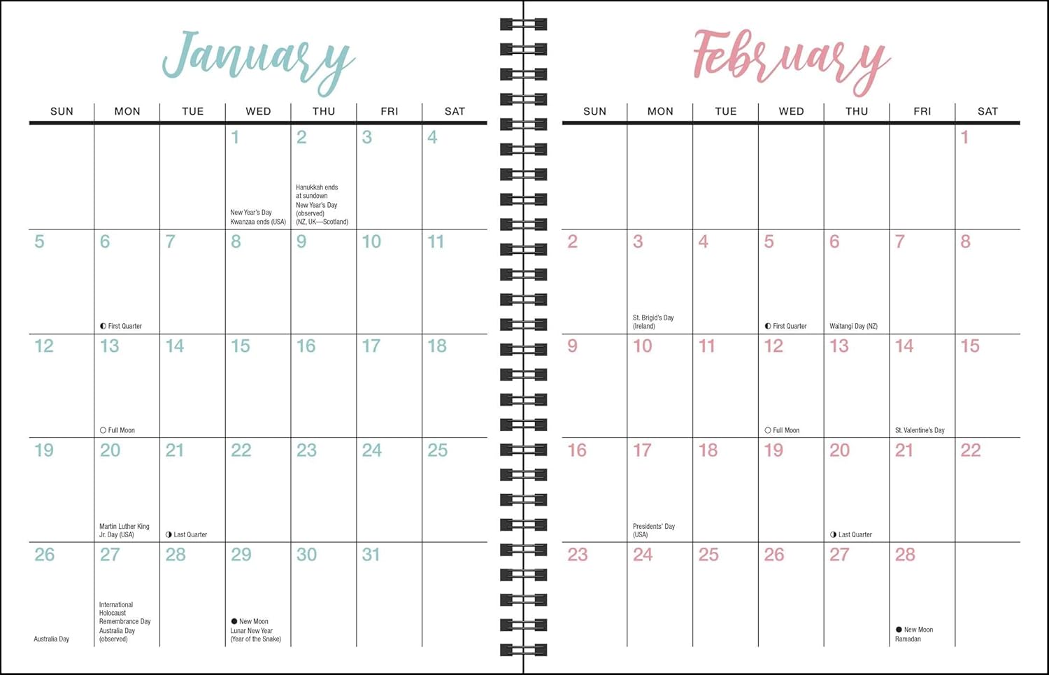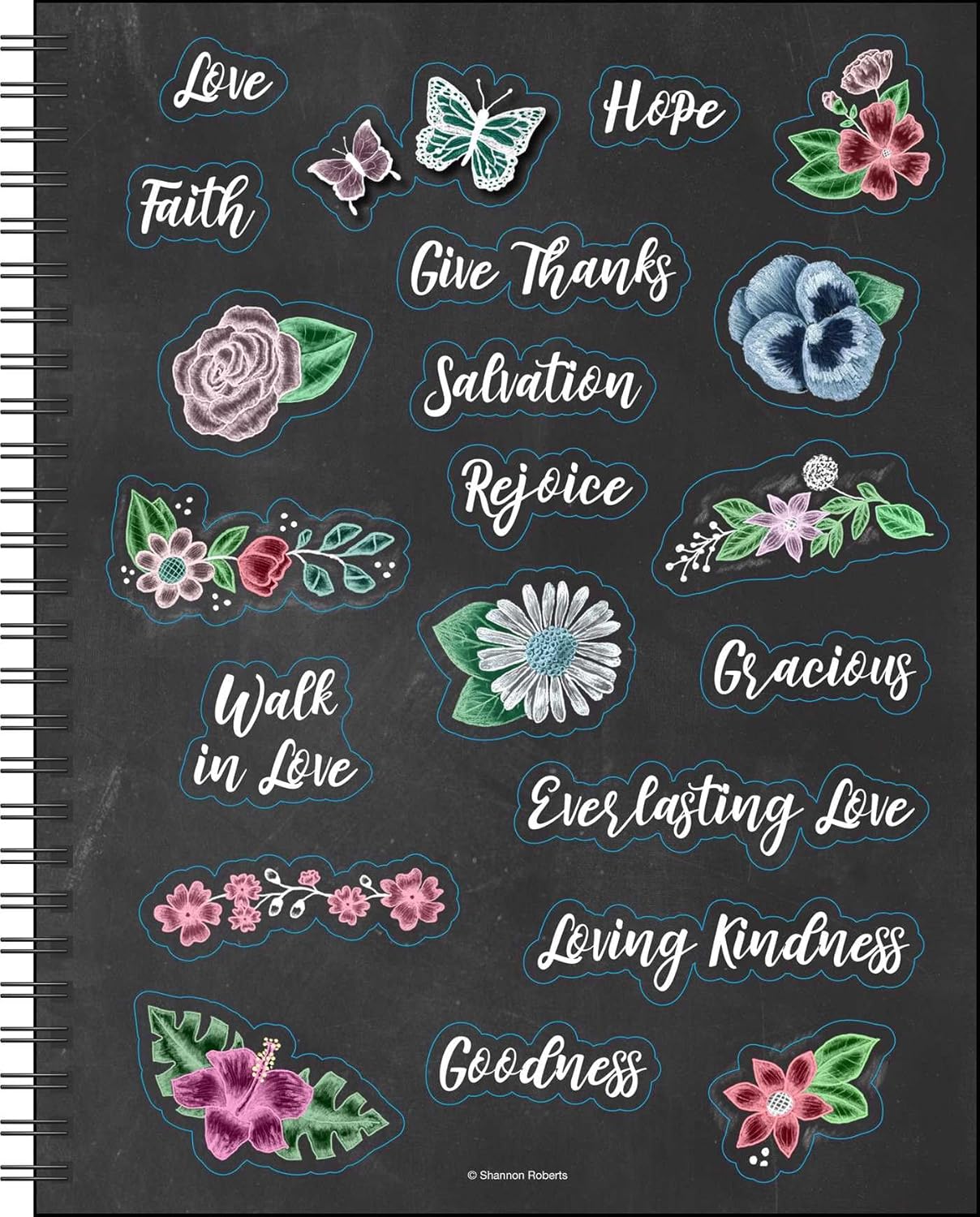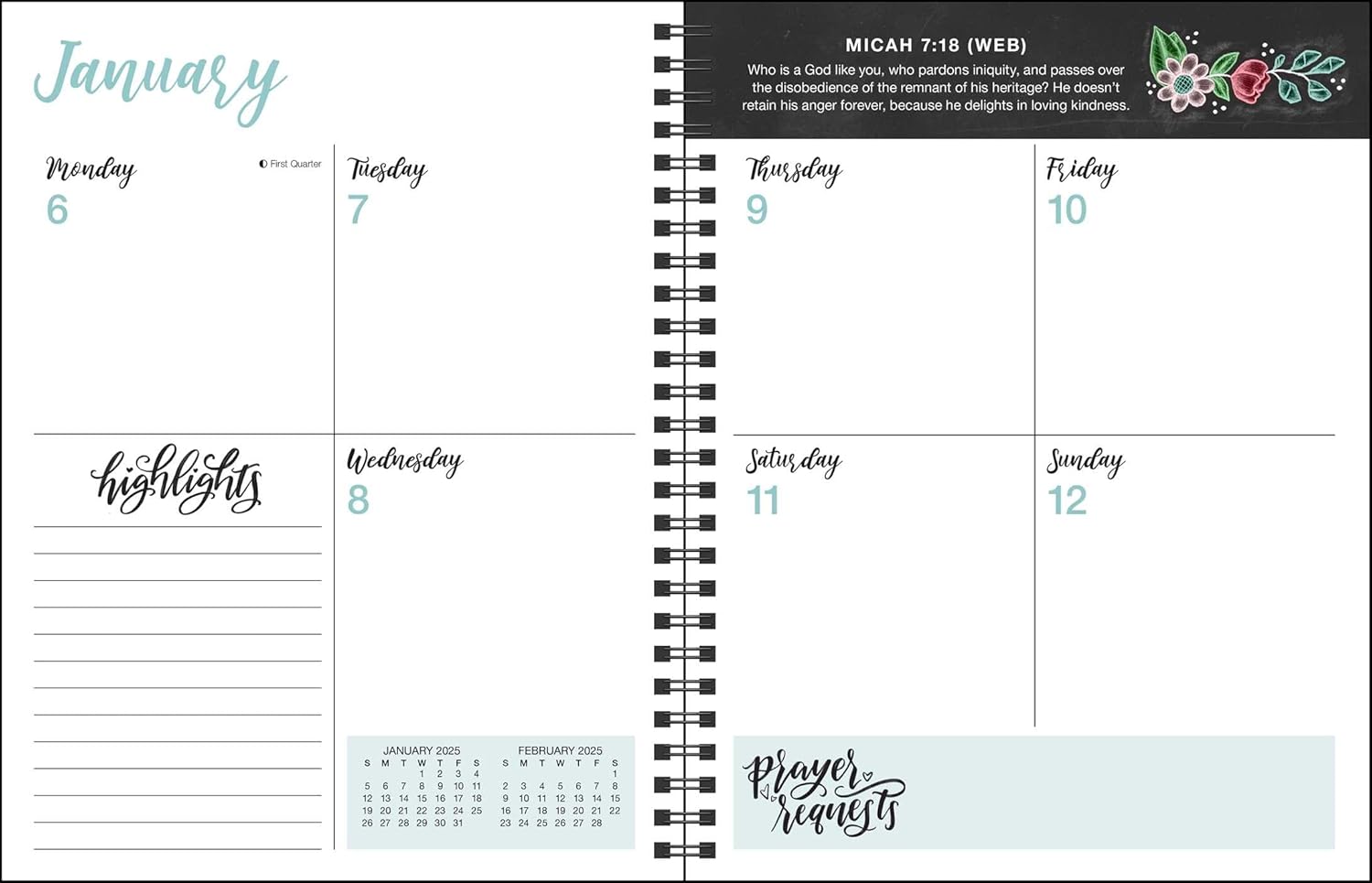 Features include: 7″ x 9″ (14″ x 9″ open) Spiral-bound Sturdy softcover Calendar lays flat when open Printed on FSC-certified paper with soy-based ink Elastic band to keep it closed 12-month planner: January–December 2025 Generous grid space for notes, appointments, and reminders Weekly spreads include chalk-art designs and plenty of room to write Extra pages at back for notes, goals, and more Year-at-a-glance pages for 2024, 2025, and 2026 A sticker sheet with decorative stickers that feature inspiring phrases and floral artwork 2 pockets for storage Official major world holidays and observances Moon phases, based on Universal Time Weekly Bible verses illustrated in Shannon Roberts’s signature chalk-art style, with journaling prompts and pages for reflection