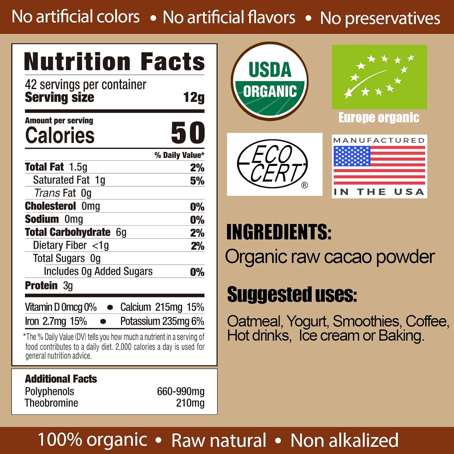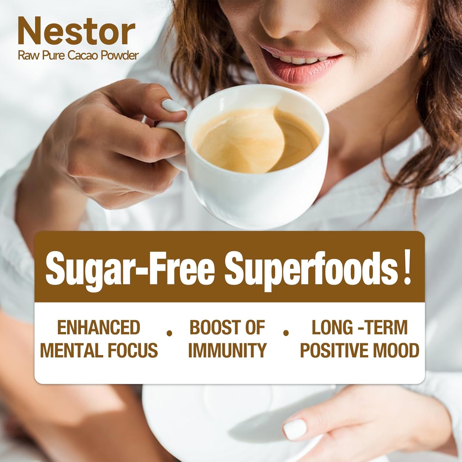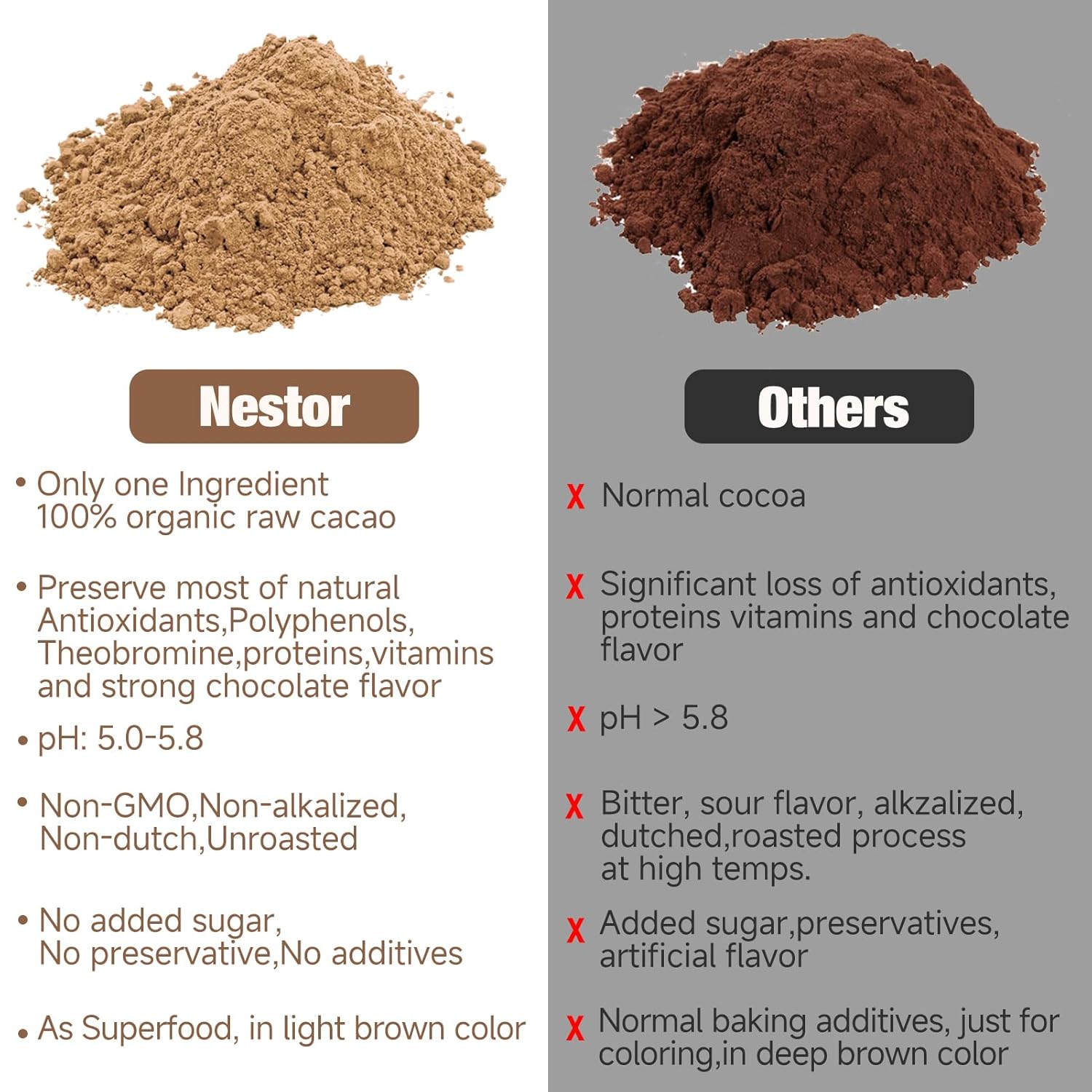 [100% Organic Certified] The Nestor premium pure natural healthy cacao powder is Europe and USDA organic certified, Gluten-free,Non-GMO and Vegan. 100% raw cacao powder, only one ingredient. You are sure to enjoy and benefit a wholesome and clean antioxidants superfood product from Nestor !!!