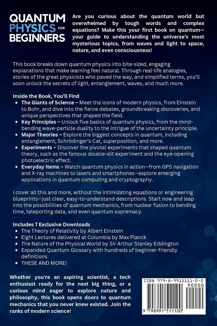 This book demystifies a traditionally challenging subject, making it accessible, engaging, and even fun for readers with little to no scientific background.The author does a phenomenal job breaking down key principles like wave-particle duality, entanglement, superposition, and the uncertainty principle using real-world analogies, storytelling, and simple language. Each chapter flows smoothly, building on foundational concepts and weaving in captivating tales of historical physicists such as Einstein and Bohr. The book’s approachable style keeps even the most mind-boggling theories within grasp.What truly sets this guide apart is its connection to everyday life—showing how quantum physics shapes the world around us, from the technology we use daily to cutting-edge innovations in computing and cryptography. The exploration of pivotal experiments like the double-slit experiment provides a tangible sense of discovery, sparking curiosity and awe.The book also includes seven exclusive downloads, which offer even more value and fascinating perspectives. This bonus content enhances the learning experience, providing both context and deeper insight for those ready to dive further.While no equations clutter the text, the book does not sacrifice depth or curiosity-inspiring content. Instead, it gives readers the confidence and understanding needed to grasp quantum mechanics’ core ideas without being overwhelmed by mathematical details.Whether you’re a complete novice, an aspiring tech enthusiast, or simply eager to grasp the profound beauty of the quantum world, this book is a must-read. Highly recommended for breaking barriers and sparking curiosity!
