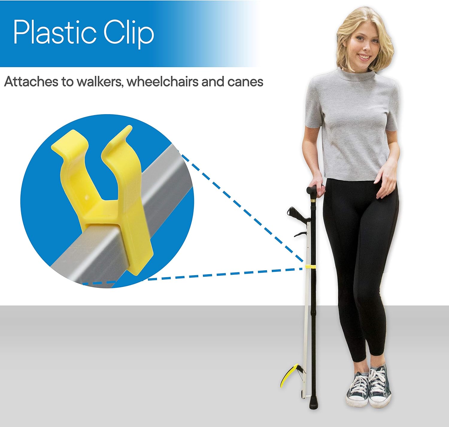 Yellow clip fastens reachers to canes, walkers, wheelchairs and hospital bed rails to keep them nearby.