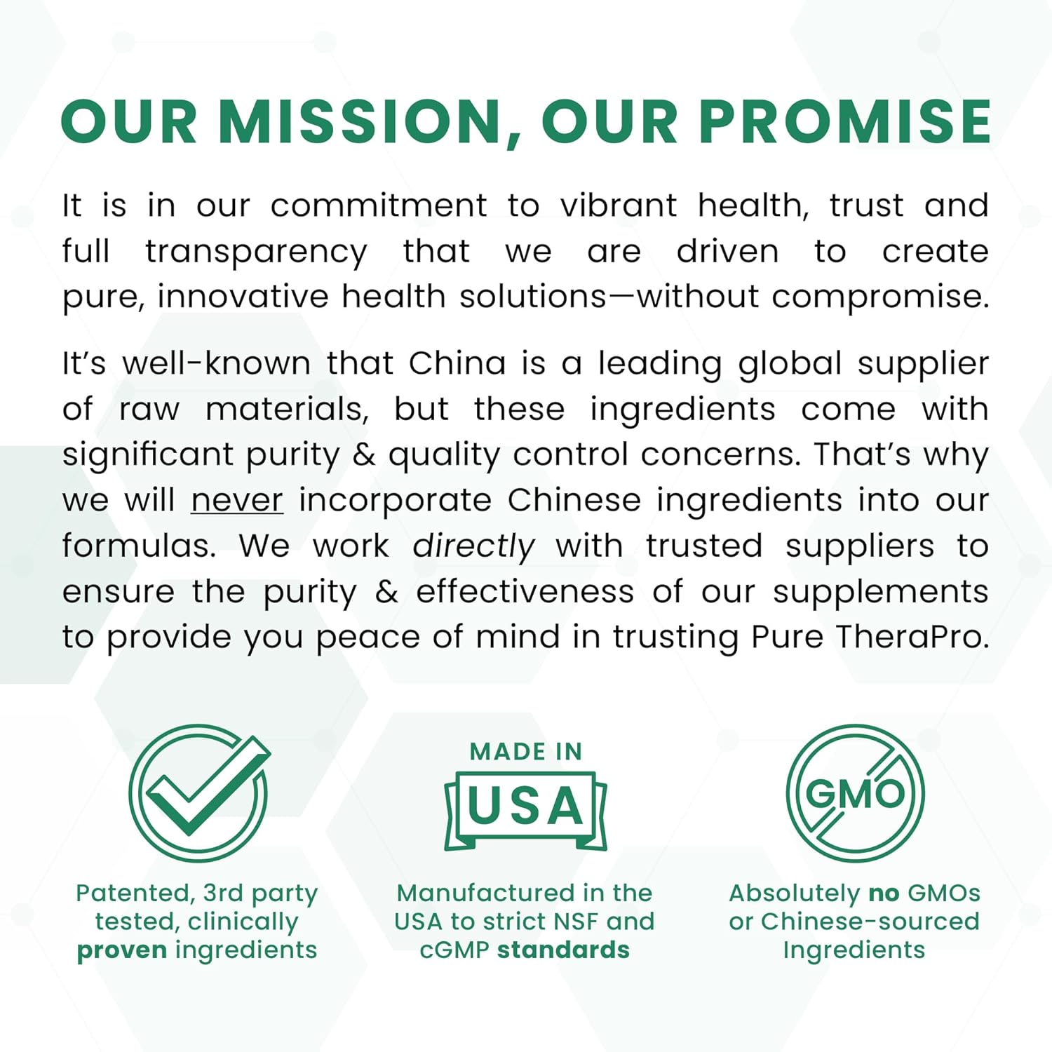 𝐀𝐁𝐎𝐔𝐓 𝐔𝐒: Pure TheraPro Rx was founded in Denver Colorado to formulate and manufacture the highest quality supplements available on the market today. Purity is our priority, which is why we insist on using patented, clinically studied ingredients, and never utilizing fillers, flow agents, excipients, or ingredients sourced from China. We also never use dairy, gluten, corn, soy, or other common allergens in any of our class-leading, practitioner-recommended formulas.